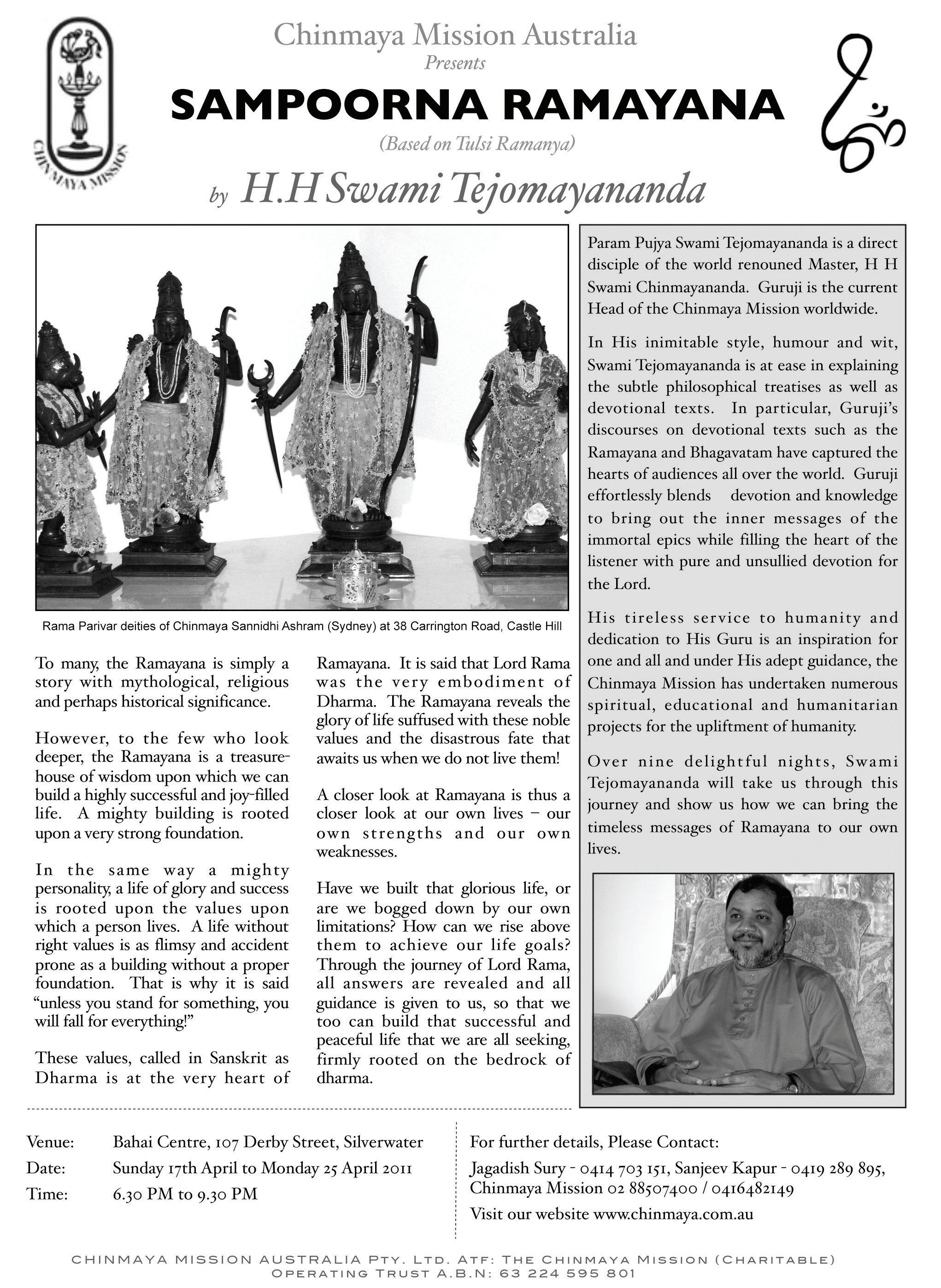 Ashram, 38 Carrington Road, Castle Hill. Details Br Gopal Chaitanya, 02 8850 7400; 0416 482 149; www.chinmaya.com.au
