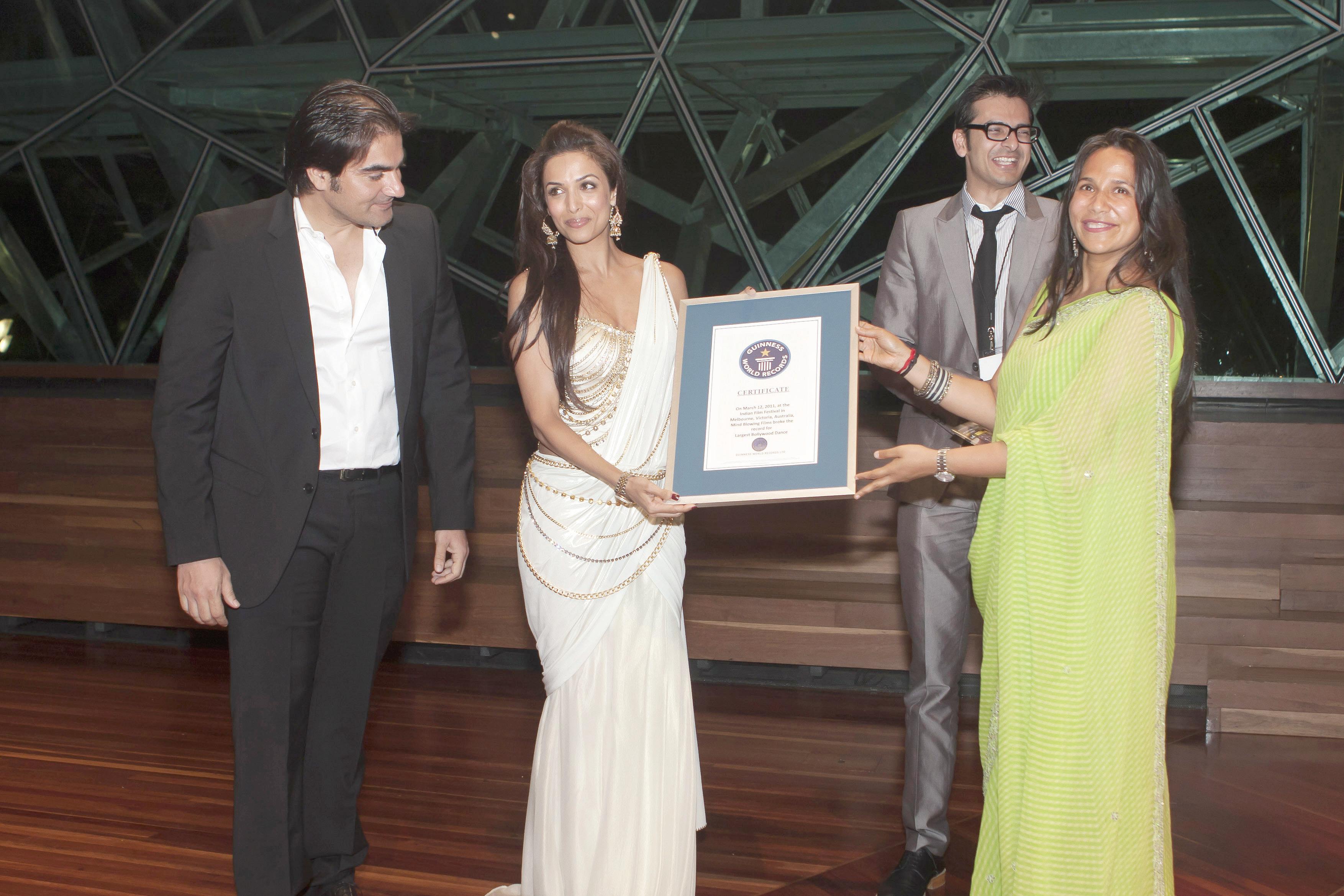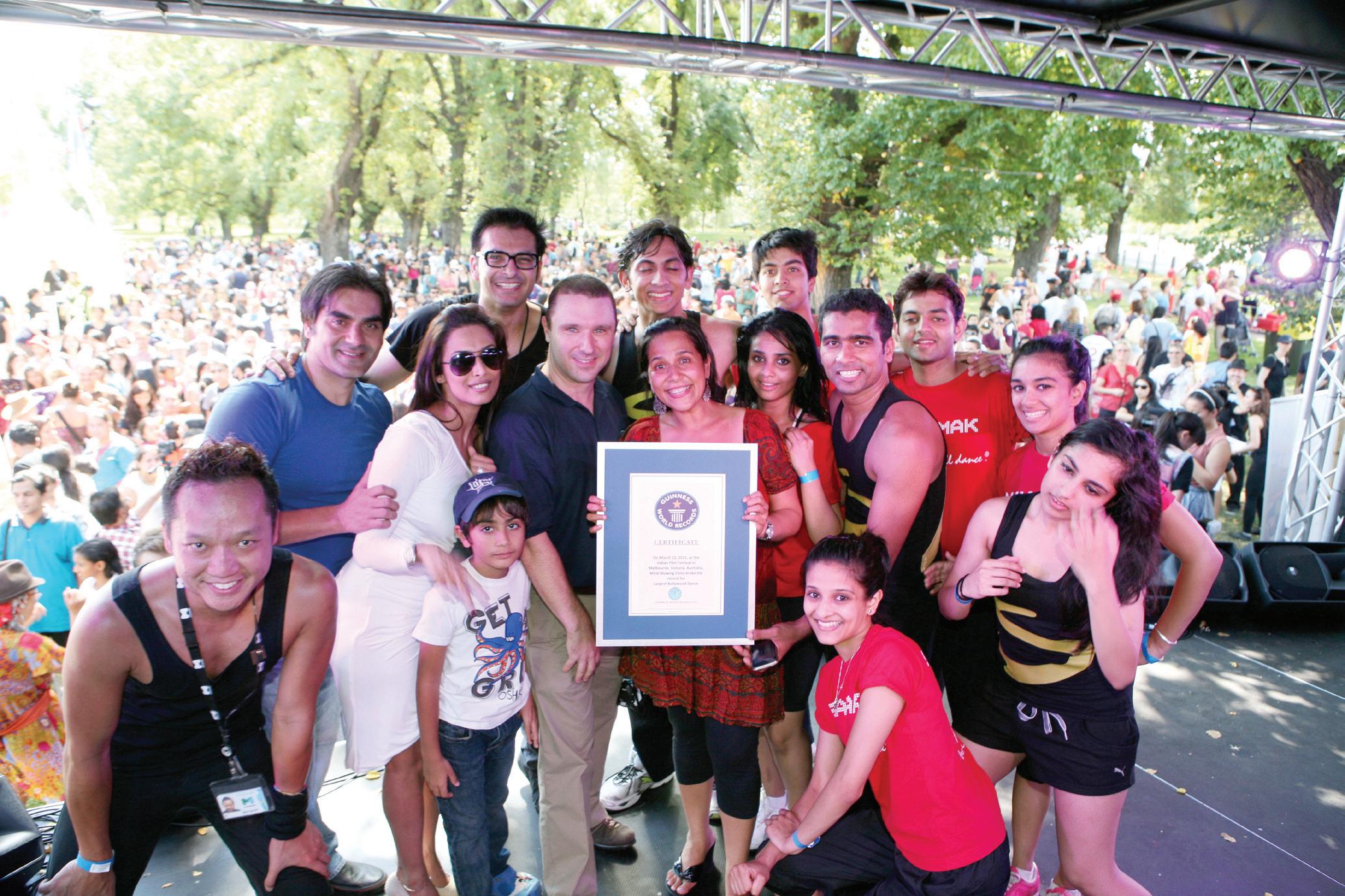 The glamorous ‘Munni’ Malaika Arora Khan led 1235 Melbourne dancers to record breaking fame with this chart buster song from her home production Dabangg. Her son Arhaan and husband Arbaaz Khan also joined the crowd of hundreds that sang, swayed and danced in Melbourne Park on the banks of the Yarra River. The event was organised by Indian Film Festival 2011- Bollywood and Beyond, supported by Moomba and Shiamak Davar International.