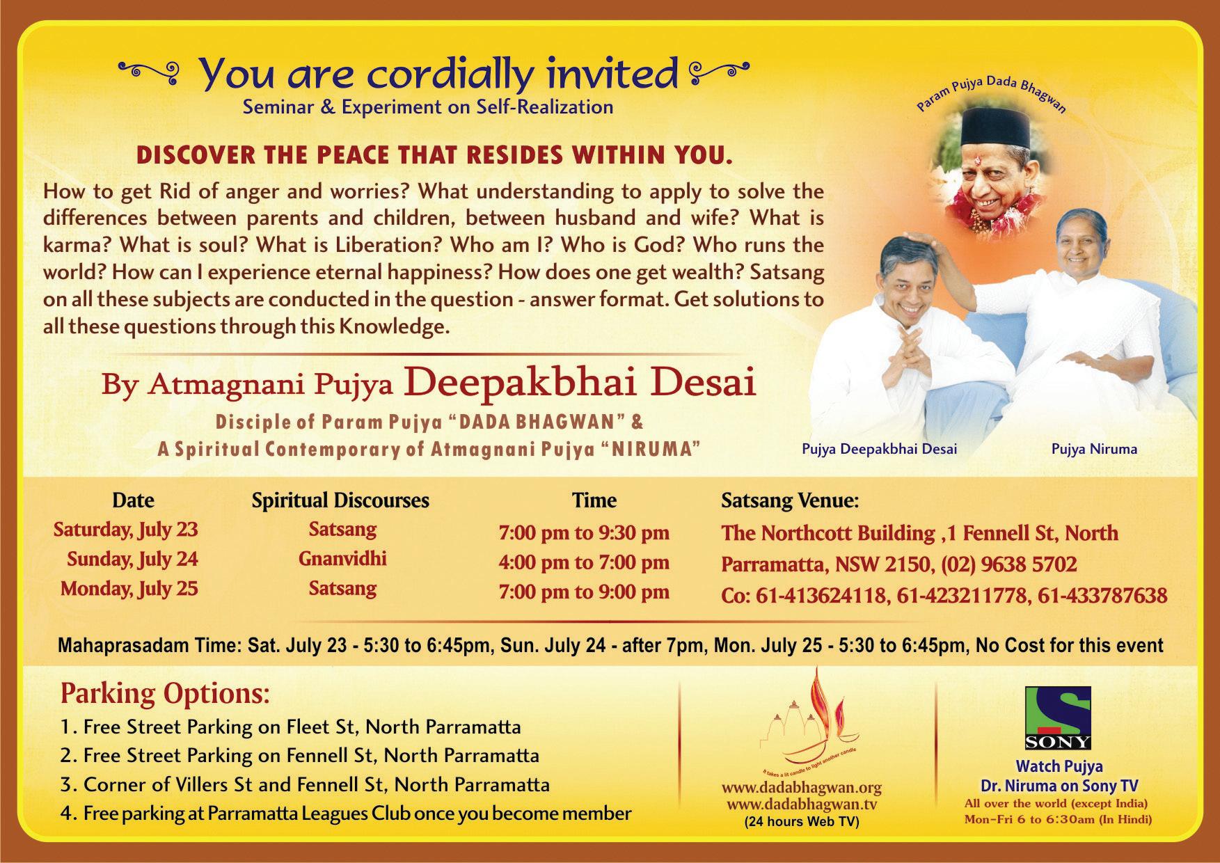 Friday 29 July (8pm) to Saturday 30 July (6pm) Local Youth Camp ‘Step Up and Meet the Infinite’ for the age group 18-30 years at Chinmaya Sannidhi, 38 Carrington Road, Castle Hill. For registration call Saumya Kandoi on 0400 999 907 or Chinmaya Sannidhi on 02 8850 7400.
