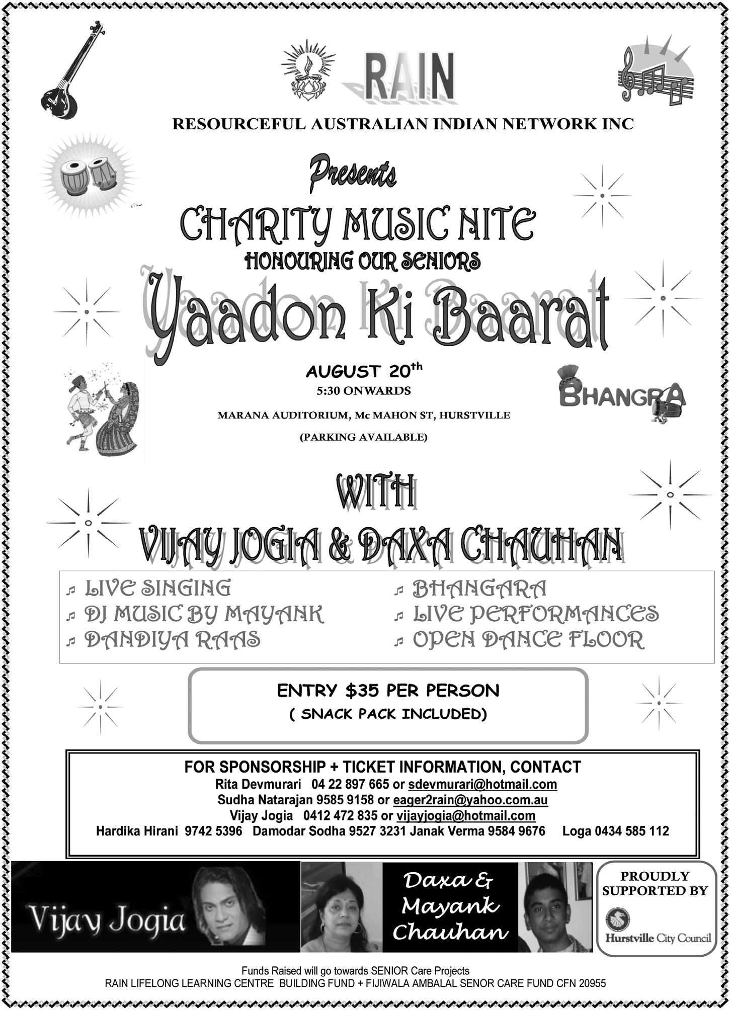 Saturday 20 August Vijay Jogia and Daxa Chauhan present a charity music night in aid of RAIN seniors group from 5:30 pm. Also featuring Bhangra, DJ music by Mayank and Dandiya Raas. For details email sdevmurari@hotmail.com