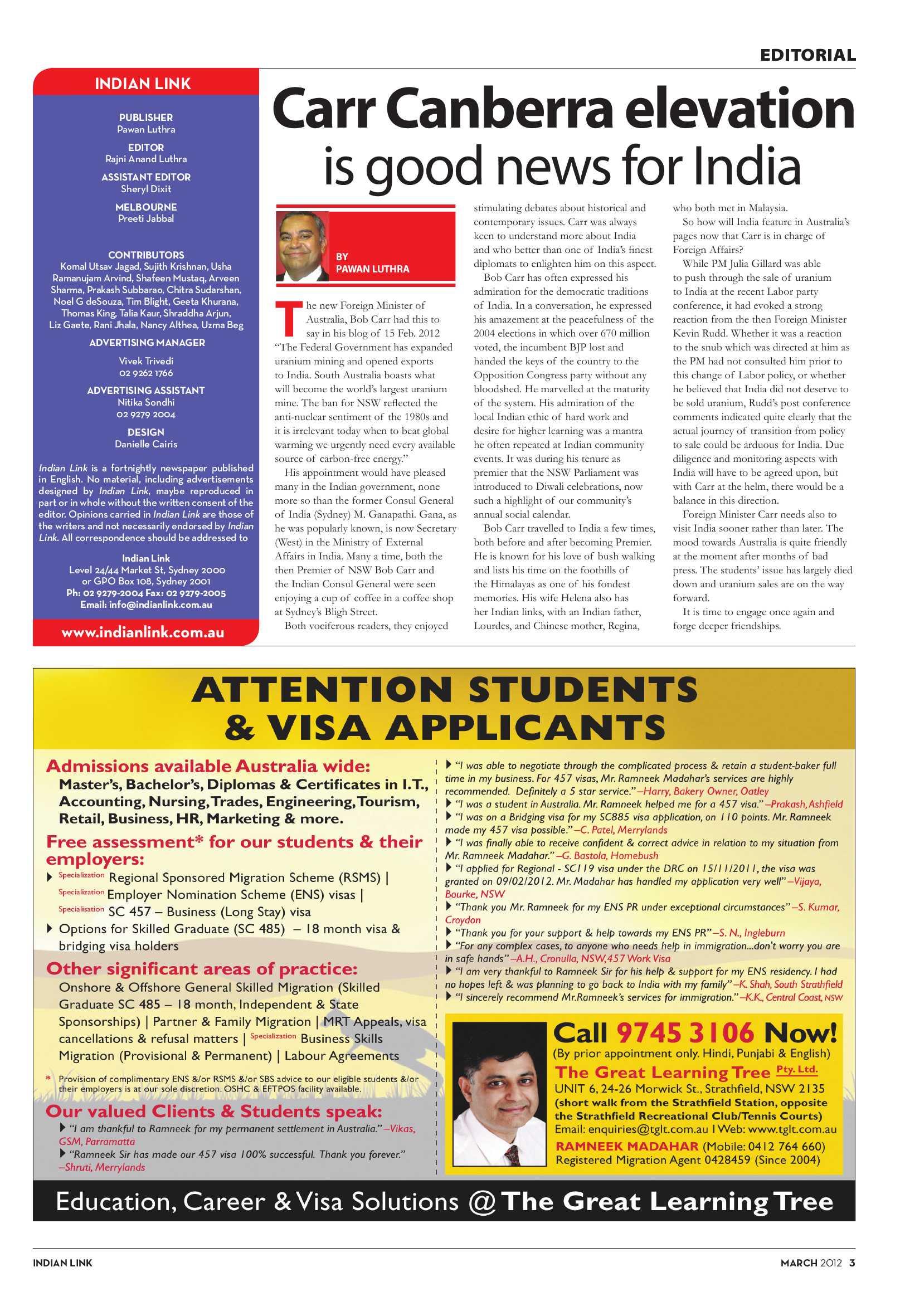 Indian Link is a fortnightly newspaper published in English. No material. including advertisements designed by Indian Link, maybe reproduced in part or in whole without the written consent of the editor. Opinions carried in Indian Link are those of the writers and not necessarily endorsed by Indian Link. All correspondence should be addressed to