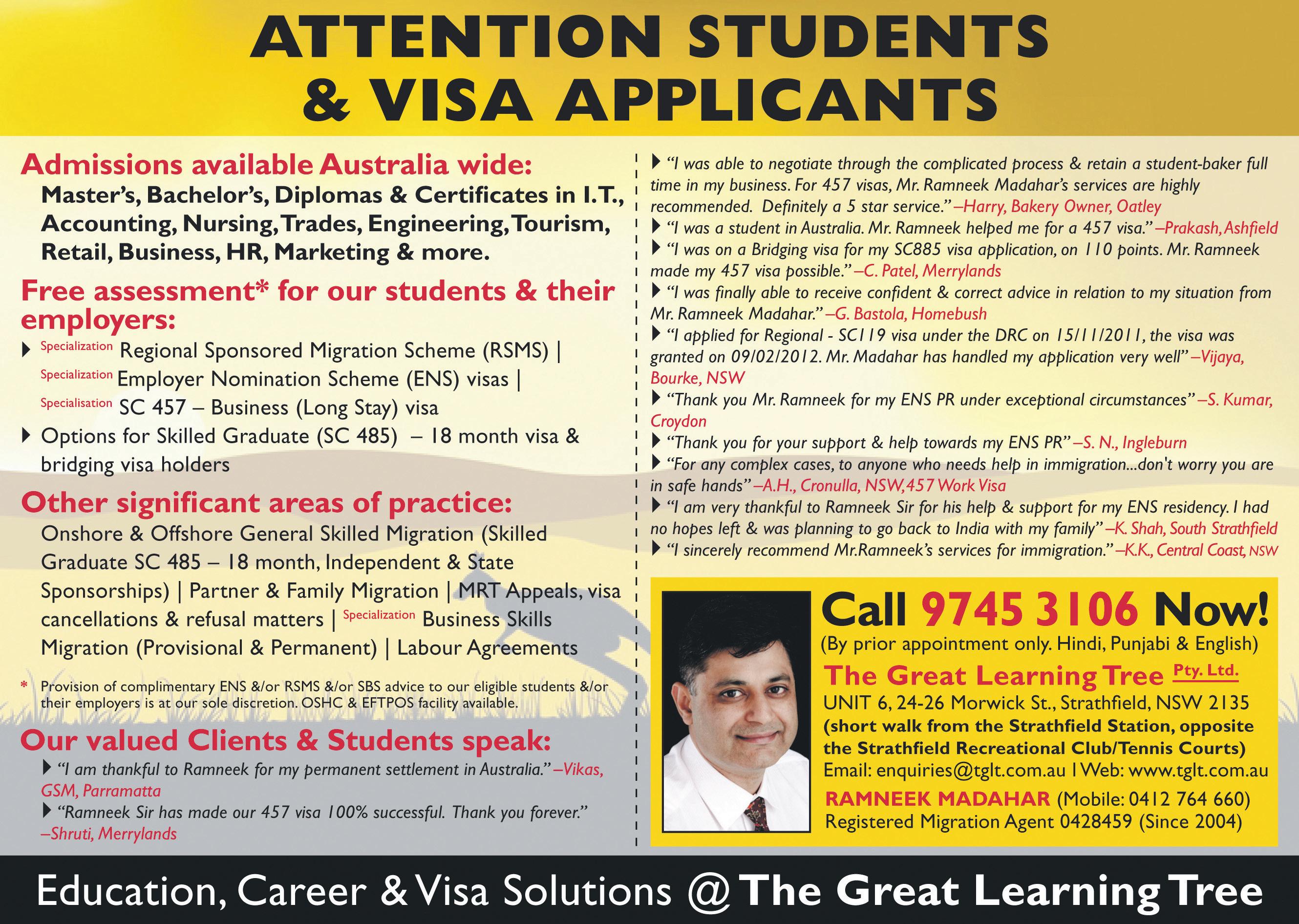 Hindi Language is offered by the Saturday School of Community Languages - DET at Liverpool Girls High School, Hills Sports High School and Strathfield Girls High School. This provides opportunities for high school students to study Hindi language to Higher School Certificate levels as it is not available at their day school. Board of Studies syllabus is followed. The classes are free of charge and are run on Saturdays from 8.30 am to 10.30 am for Years 7 – 10, and 8.30 – 11.45 am for Years 11-12. Enrolment forms can be accessed from the School Principal of the mainstream school of your child or can be downloaded from www. curriculumsupport.education. nsw.gov.au/secondary/ languages/sscl/ Details 02 9886 7505; Saturdaycl-h.School@det.nsw. edu.au