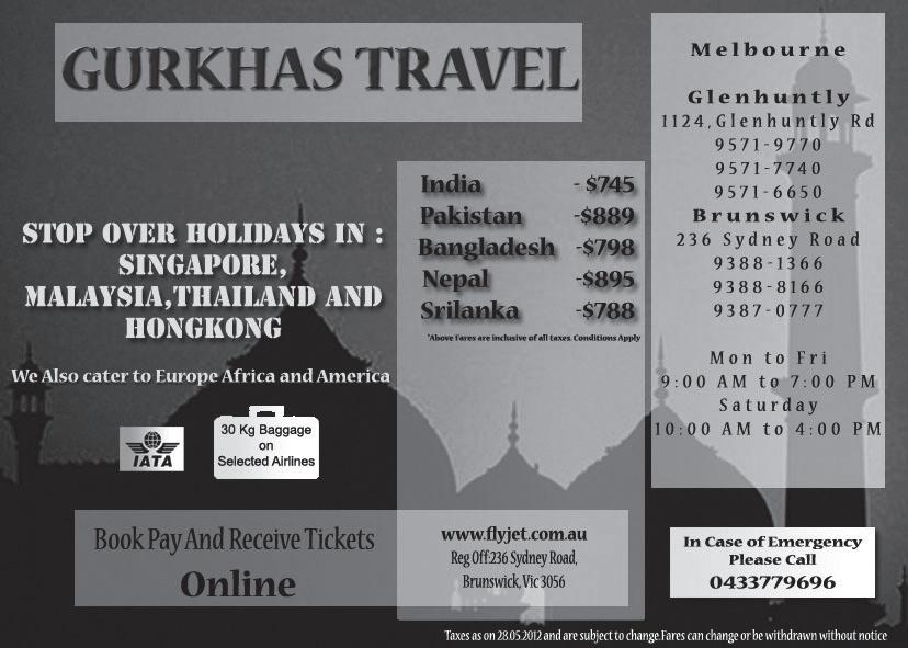 JUNE 2012 7 INDIAN LINK CHEAPEST AIRFARES TO INDIA, PAKISTAN, SRI LANKA, BANGLADESH, NEPAL, AFGHANISTAN. Kamlesh Patel: 0412 302306 Abdullah: 0430 553246 Ph: (03) 9793 0095 Fax: (03) 9793 0092 Email: k.patel@bookandfly.com.au, abdullah@bookandfly.com.au ADD: 20 Clow Street, Dandenong. VIC 3175 Send Money To India, Pakistan, Srilanka, Bangladesh, Afghanistan. Guaranteed Best Rates* *Conditions Apply Dhaka $960* Pakistan $995* India $950* Colombo $950* (*incl. taxes, 30kg luggage) 4 Individual Tax returns 4 Business Advisory & Taxation 4 Business activity statements 4 Company Accounting & Tax Returns 4 Trust Accounting & Tax Returns 4 SMSF Compliance & Tax Returns 4 Business, Company & Trust Setup 4 BAS & GST 4 Business Plans 4 Cash flow projections Our Services Call 1300 468 222 Full time offices NOW in Adelaide & Caroline Springs Offices located at: “We thrive for Excellent Service & Client Satisfaction” Harish Bisam Director Glenhuntly 1135, Glenhuntly Rd, Glenhuntly, VIC 3163 Caroline Springs Suite1, 218-222, Caroline Springs Bld, Caroline Springs, VIC 3023 Next to Contours Gym Adelaide Suite 26, Level5, 121 King William Street, Adelaide 5000 Melbourne Suite 808, 365 Lt Collins Street, Melbourne, VIC 3000 IT Payroll IT Recruitment Business Advisory & Consultants Medicare levy Exemption certificate Application for free Only $60 tax return for students and under 21’s
