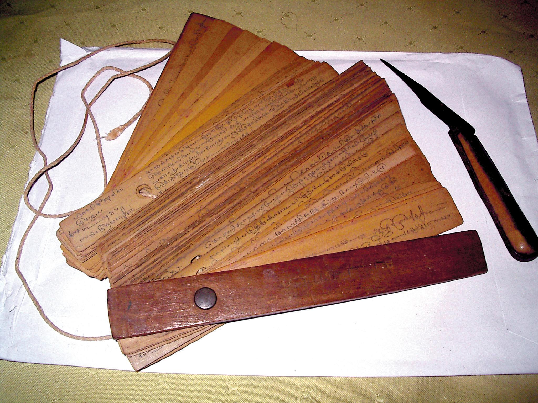 Next I pulled out my trump card. A stack of palm leaves the size of Mars bars with wooden pieces of the same size on the top and bottom, serving as protective cover. Written with a stylus, every word on those leaves pops out like a pearl. It is of 19th century origin