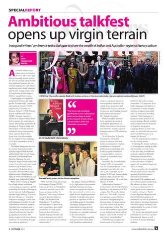 Tc is in part, the story o f a Dell1i girl, Dr Mridula Nath Chakraborty from the Writing and Society R esearcl1 Ce n tre (WS RC) at the Unive rsity of Western Sydney (U\X7S), t he passi on and brains behind AILIF. The story b ears celling because it reaffirms the value of multilingualism and the value of a ground -b reaking event such as 1ULIF. It began when Dr C h akraborty or Mridula as she is familiarly called, became fascinated by the work of the ce lebrated Hindi write r, Munshi Premchand when smdying in an Engli sh medium school in Ddhi. Up on the insistence of her m other, she d1en learnt co read and write in her mother tongue, Bengali. The story con tinued when Mrid ufa began wo r king with Katha, the acclaimed publishing house chat specializes i.o translations, and she feU d eeply in love with Indian literature in translation, findi ng a " renewed se nse of d1e famastically expressive intricacies and idio m s of the vernacula r to ngues, the regi onal la nguages o f India". Howe ve r, it is u pon her arrival in Australia that the p lot chickens. Mridula's e loquent words tell us of a journey of revel ation, one chat many of us have undertaken as lnd ia.n immigrants co Aus u-alia, finding d1at A ltStralia is truly