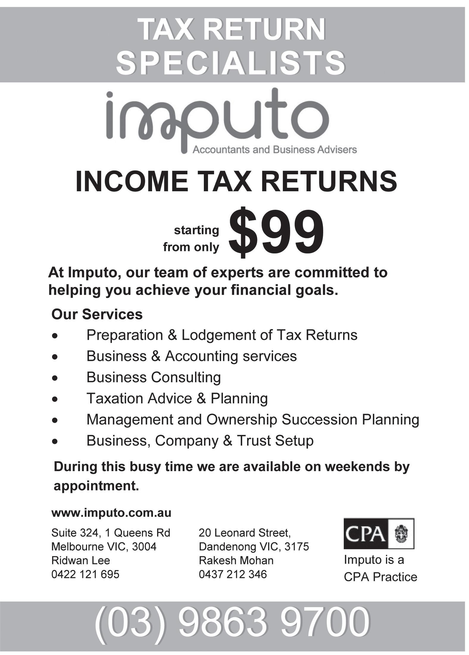 EDITORIAL 4 Individual Tax returns 4 Business Advisory & Taxation 4 Business activity statements 4 Company Accounting & Tax Returns 4 Trust Accounting & Tax Returns 4 SMSF Compliance & Tax Returns 4 Business, Company & Trust Setup 4 BAS & GST 4 Business Plans 4 Cash flow projections Our Services Call 1300 468 222 Full time offices NOW in Adelaide & Caroline Springs Offices located at: “We thrive for Excellent Service & Client Satisfaction” Harish Bisam Director Glenhuntly 1135, Glenhuntly Rd, Glenhuntly, VIC 3163 Caroline Springs Suite1, 218-222, Caroline Springs Bld, Caroline Springs, VIC 3023 Next to Contours Gym Adelaide Suite 26, Level5, 121 King William Street, Adelaide 5000 Melbourne Suite 808, 365 Lt Collins Street, Melbourne, VIC 3000 IT Payroll IT Recruitment Business Advisory & Consultants Medicare levy Exemption certificate Application for free Only $60 tax return for students and under 21’s