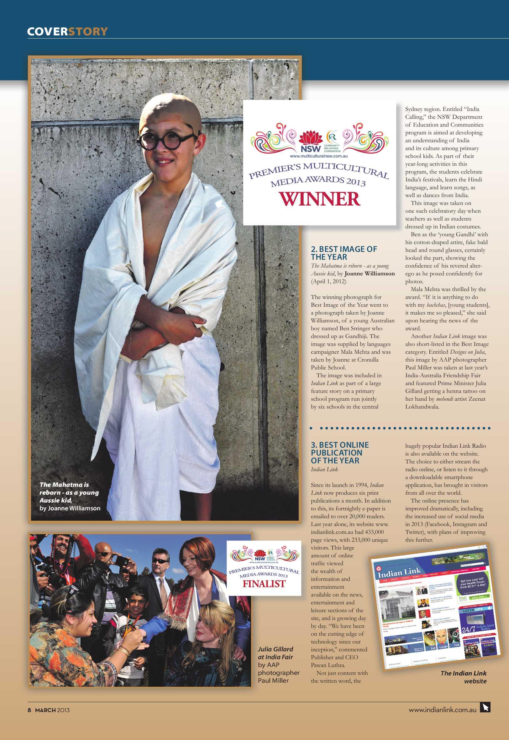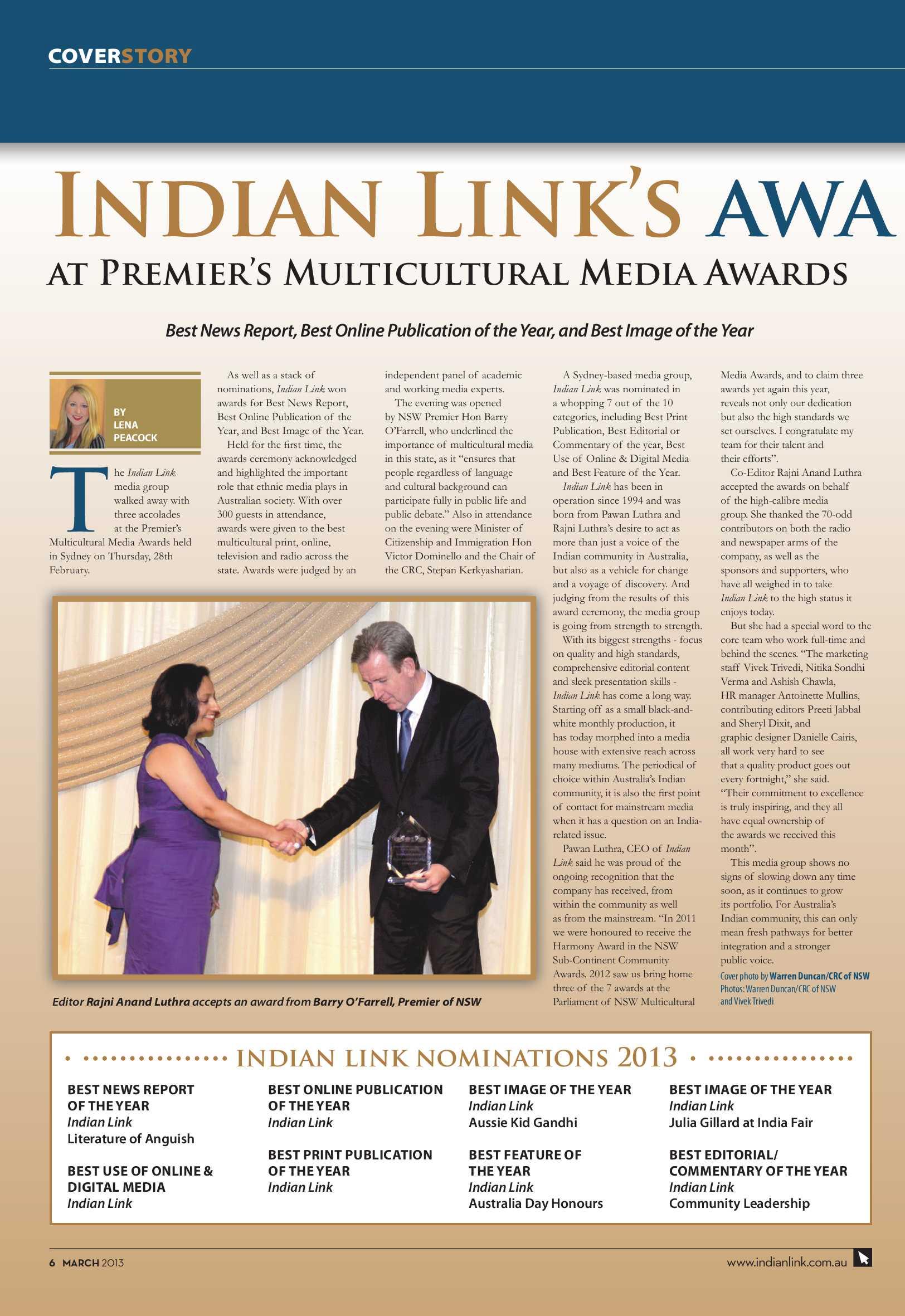 A Sydney- based media g roup, Tndiau Link was nominated in a whopping 7 our of the 10 categories, i..nduding Best Print Publicati o n, Best Edi tori.al or Commentary of the year, Best Use of Online & D igital Media and Best Featlll'.e o f the Year.