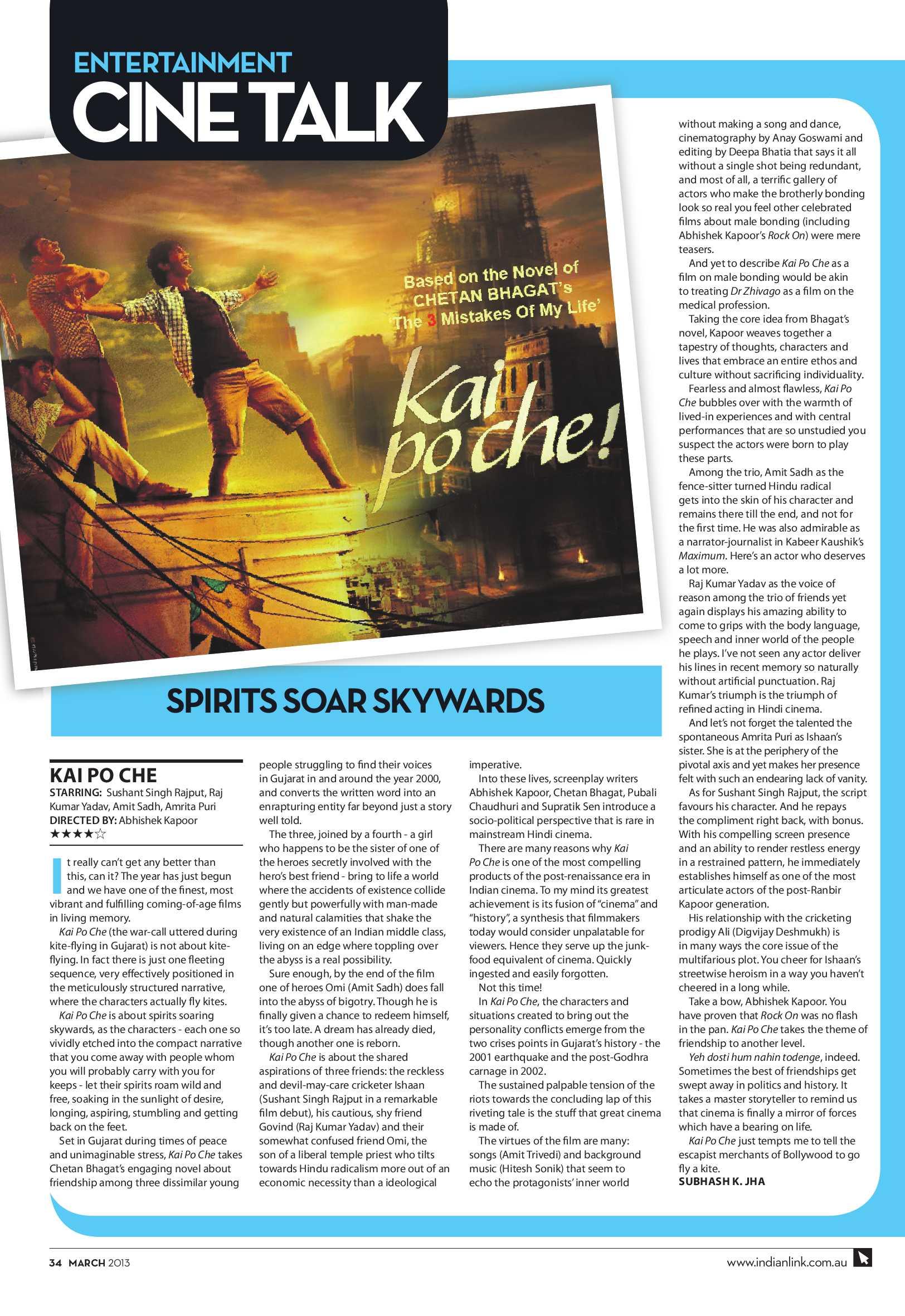 Fearless and al most flawless, Kai Po Che bubbles over with the warmth of lived-in experiences and with centra l performances that are so unstudied you suspect the actors were born to play these parts