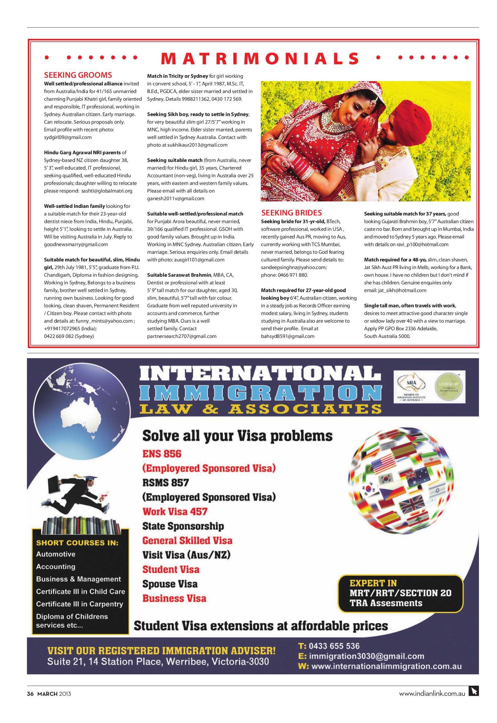 Match in Tricity or Sydney for girl working Well settled/professional alliance invited in convent school, 5' · 1•: April 1987, M.Sc. IT, from Australia/India for 41 / 165 unmarried B.Ed., PGDCA, elder sist er married and settled in charming Punjabi Khatri girt, family oriented Sydney. Details 9988211362, 0430 172 569. and responsible, IT professional, working in Sydney. Australian citi zen. Early marriage. Can relocate. Serious proposals only Email profile with recent photo: sydgirl09@gmail.com