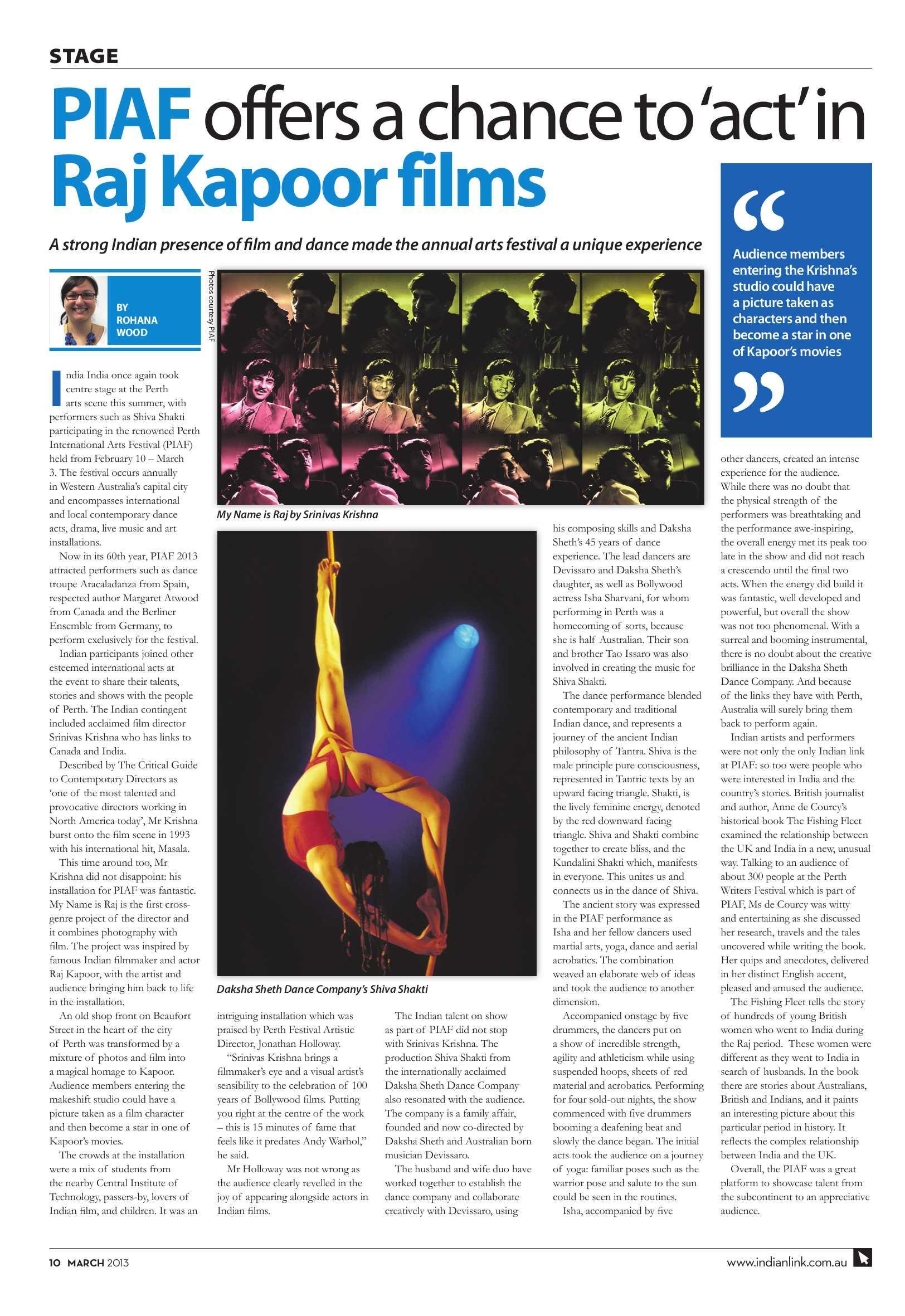 BY ROHANA WOODIndia India once again took centre stage at the Perth arts scene this summer, with performers such as Shiva Shakti participating in the renowned Perth International Arts Festival (PIAF) held from February 10 - March 3 The festiv al occurs annually in Western Australia's capital city and encompasses in ternational and local contempora1·y dance act~, drama, live music and art installations.