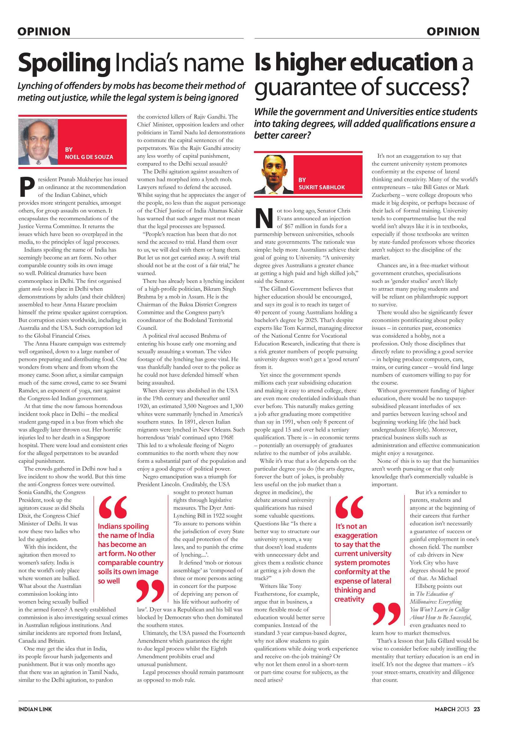 The Gillard government seems to be particularly keen to splash a few b illi on arou nd Onl y this week (and at d1e time of writing rbi s, iris Wednesday), $1.2 biUio n has been allocated ro salary increases in d1e aged care secto r; Wes tern Syd ney has been p romised SI b ill ion for a new road project (su b ject to conditions); last week Prime M inister Gillard unveiled a $1.1 billion school reading blitz and the wee k before she made a p i tch to blue-coUar workers, unveiling d erails of the Government's new $1 b illion jobs package, All o f chis, toge ther with promises in t he past, have even the Business Council of Australia worried, due ro the $49 billion b lack bole of unfun ded new spending commitments And this is before fonding has been decided for wha r seem tO be two of Labor's re -e lection p latforms, d i e National Disability I n surance Scheme (NDIS) and the Gonski Education reforms, which are both slated to cost about $10 b illion dollars a year Where the danger lies in these promised expenses for d1e rap idl y increasing Indian Australian community, i s d1e impact thi s spending - which has not been balanced by income - w ill ha,,e over d1e longer term. This c an mean increased taxes on the aspiratio n al and hard-working Jndian community, o r