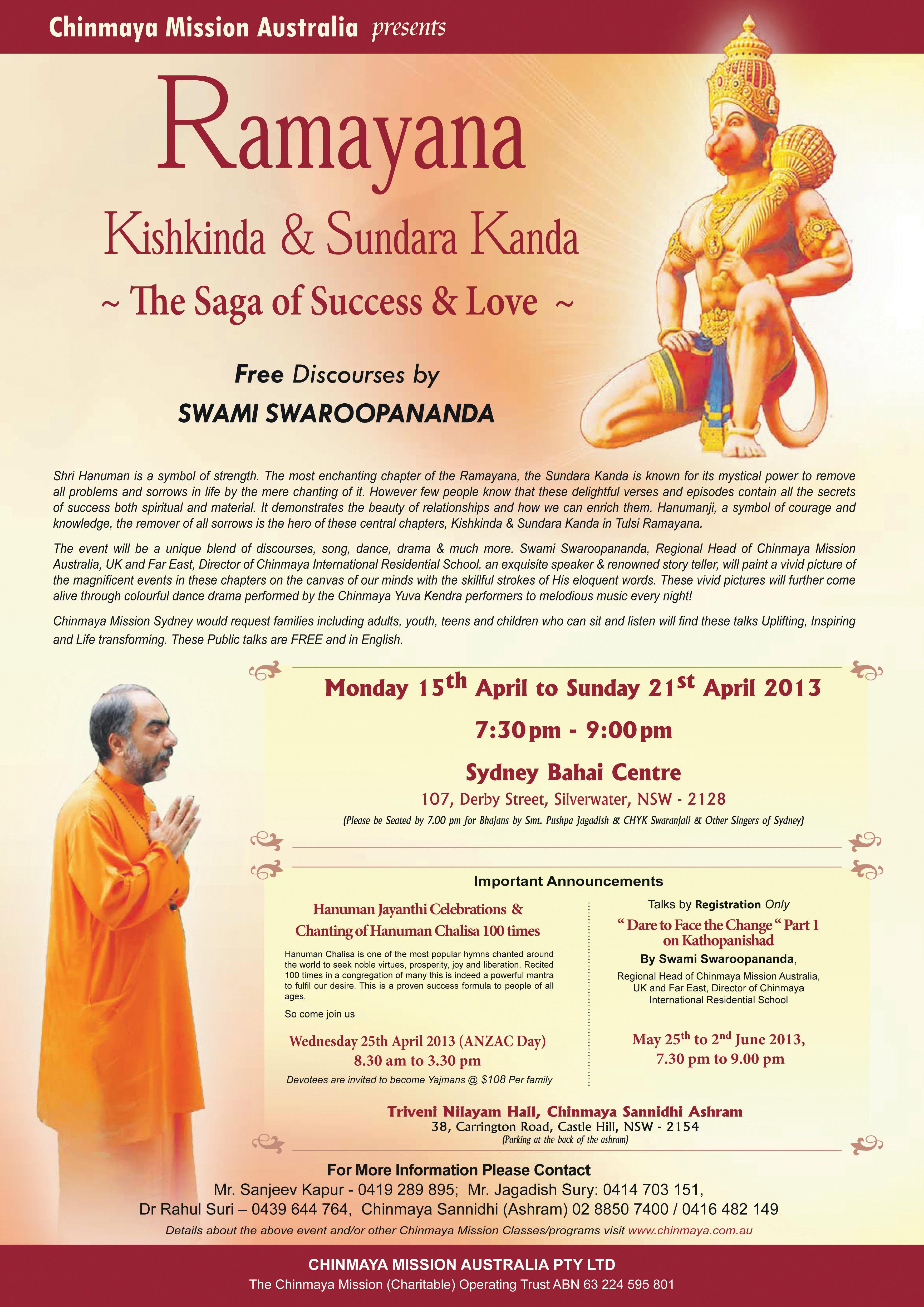 Free public talks by Swami Swaroopananda, based on the Tulsi Ramayana - Sundarakanda and Kishkinda Kanda, including short plays on the Ramayana each night at Sydney Bahai Centre, 107 Deby St, Silverwater, NSW. Details