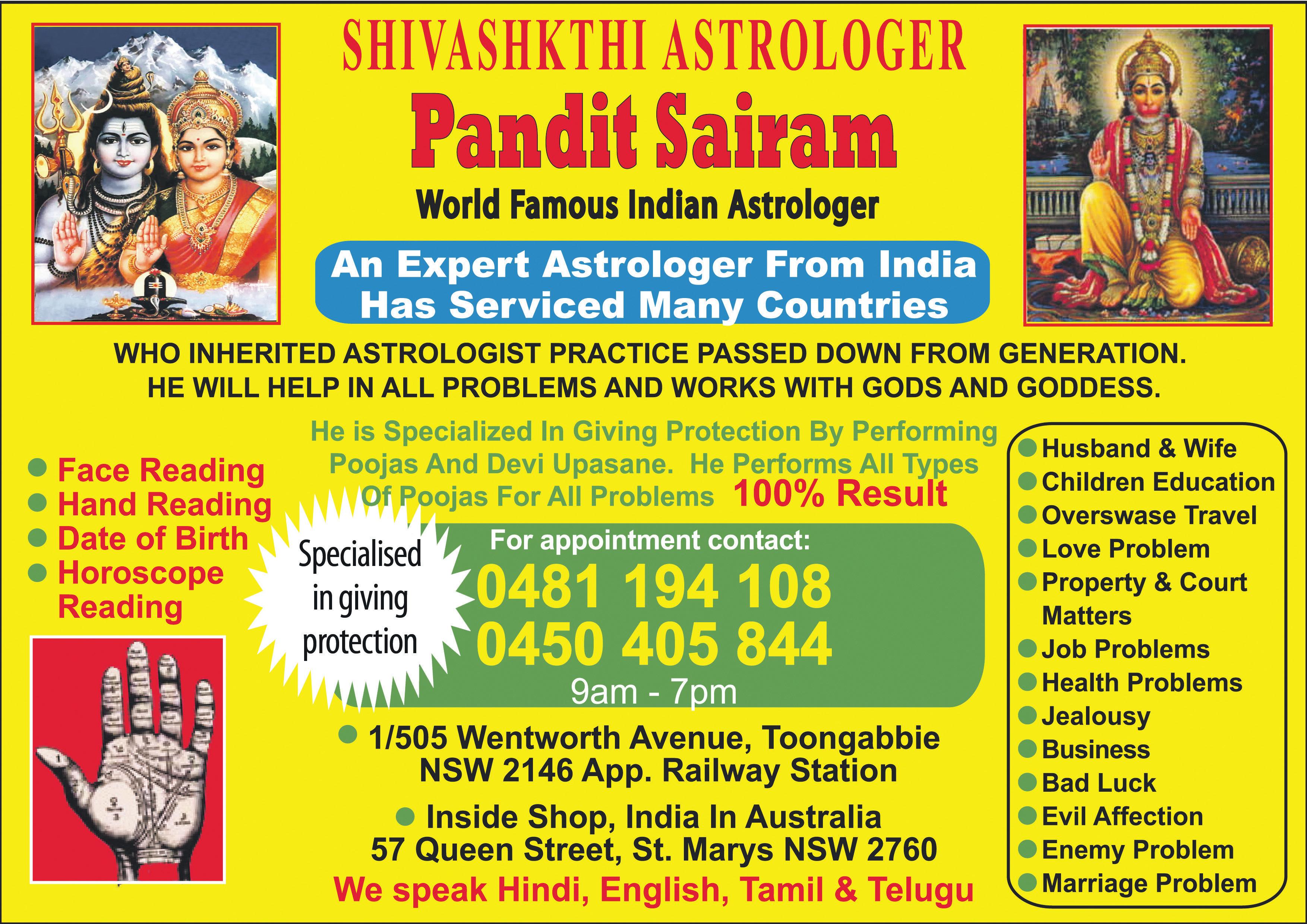 Om Care (Sri Om Foundation) holds annual Seniors Week Celebrations at Auburn Town Hall, No. 1 Susan Street, Auburn. The program includes multicultural concerts and talented performances by children, youth and seniors, along with talks by eminent doctors, and the release of a special edition of Prathama, Seniors News Magazine. Details Jay Raman 0410 759 906.
