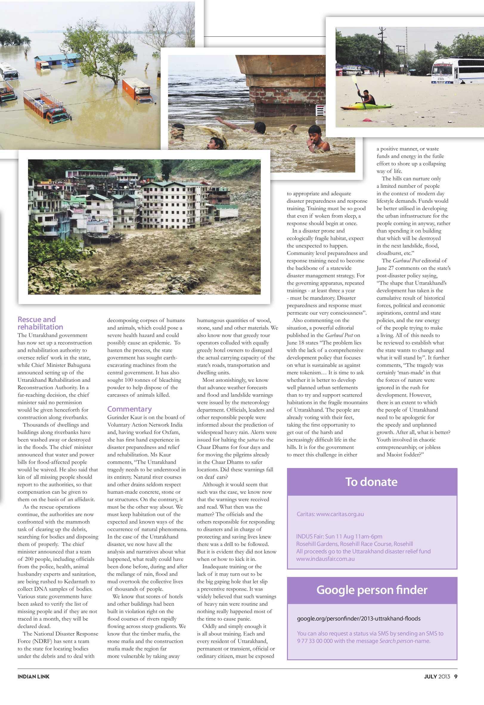 Licessanc and intense rai11s hit me hlll state over diree days from June 14, triggering Aash Aoods and landslides, leading to hundreds of deaths and resulting in mousands more tTi.issing. Though over 100,000 peop le have been evacuated so far, at the time of going ro press, hundreds were still stranded at various poims across the state. At last count, approximately 800 peop le were dead and over 3,000 missing, but diese were just estimated based on what evacuated people recounted to the rescue teams and to government officials.