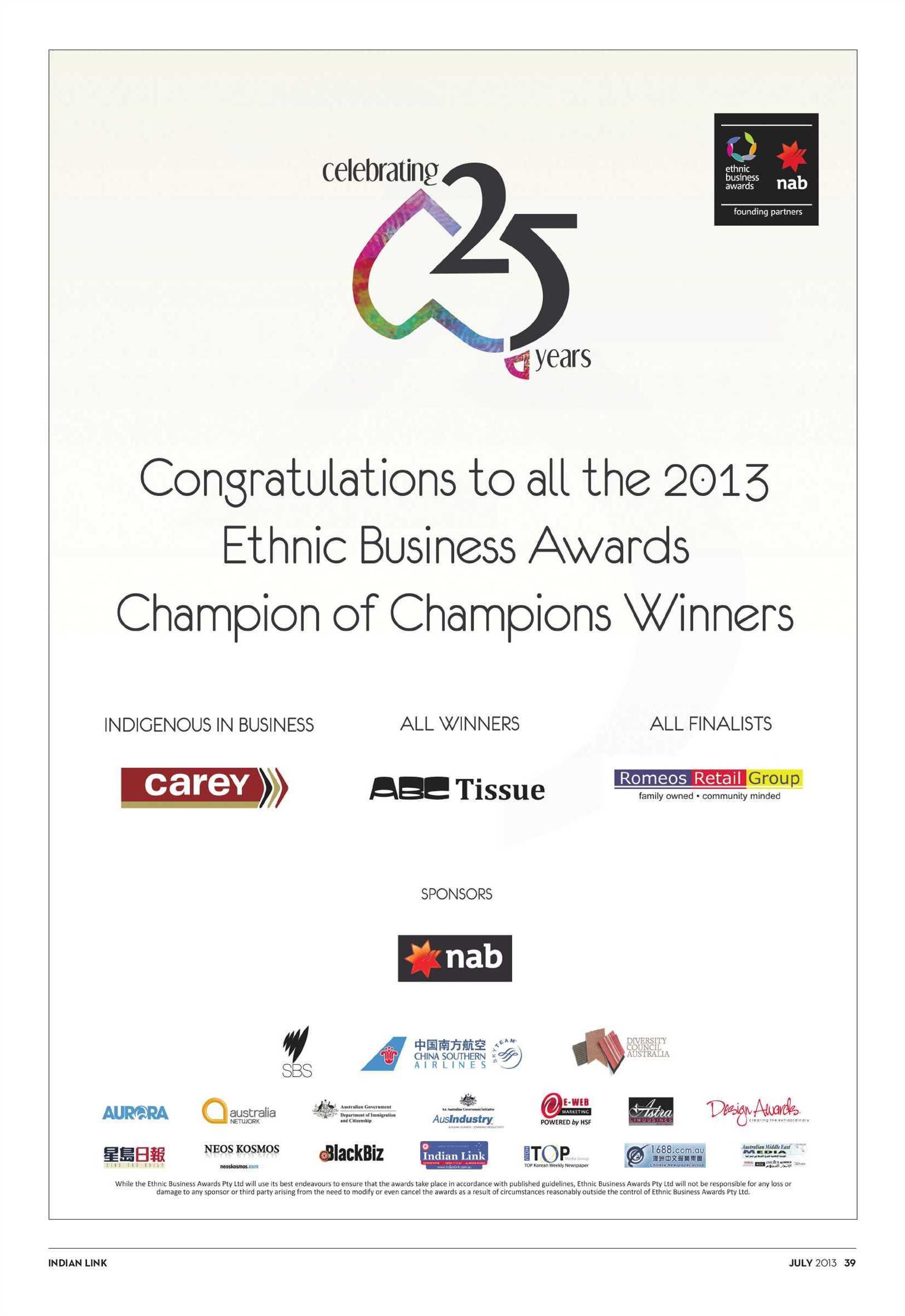 celebrating ears ethnic business awards nab founding partners Congratulations to all the 2013 Ethnic Business Awards Champion of Champions Winners IND IGENOUS IN BUSINESS ALL WINNERS ALL FINALISTS australia NETWOlll( ~~I!! Tissue SPONSORS tt:i ooiW:nmt~ " OIINA SOUTHERN " AIRLINES ,: ~ POWERED b y KSF Romeos Retai l Group family owned • community minded DIVERSITY COUNCIL AfJSTRALlA ~G Bffl NEOSKOSMOS <dllackBiz INDIAN LINK ' ' -While the Elh nle Bus iness Awards Ply Ltd will use I U best endeavours 10 ensure that the awards take place In accordance wi th published guldelines, Ethnic Business Awards Ply Ltd wiO not be res po nsible for any loss or damage to any spo nsor or third party arising from the need to modify or even cancel th e awards as a ,e sult of circu mstances reasonably outside the control of Ethnic Business Awards Pty Ltd JULY 2013 39