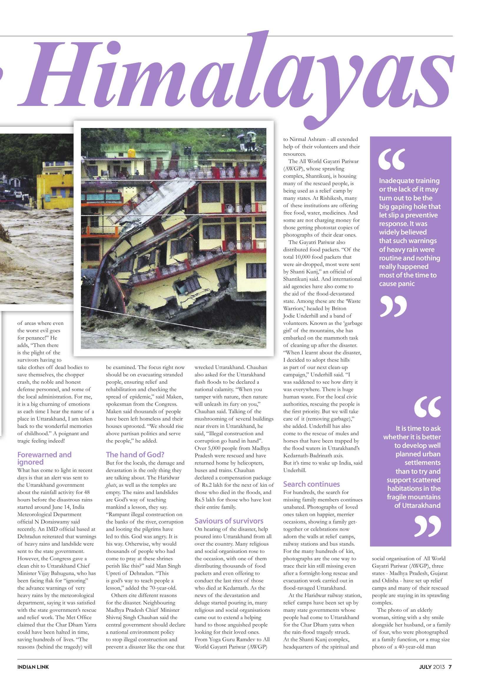 Pilgrimages to places like Kedamath and Badrinath, home to among me most revered Hindu shrines, have been all but washed away. Entire villages and small towns have simply disappeared in me Aood waters, with bridges and roads swept away, cutting off large areas, as weU as homes, hotels and businesses. Power lines have been damaged and die loss of life is tragically high. To make things worse, continuous rain and fogg y conditions seriously hampered rescue operations in the first week of the tragedy.
