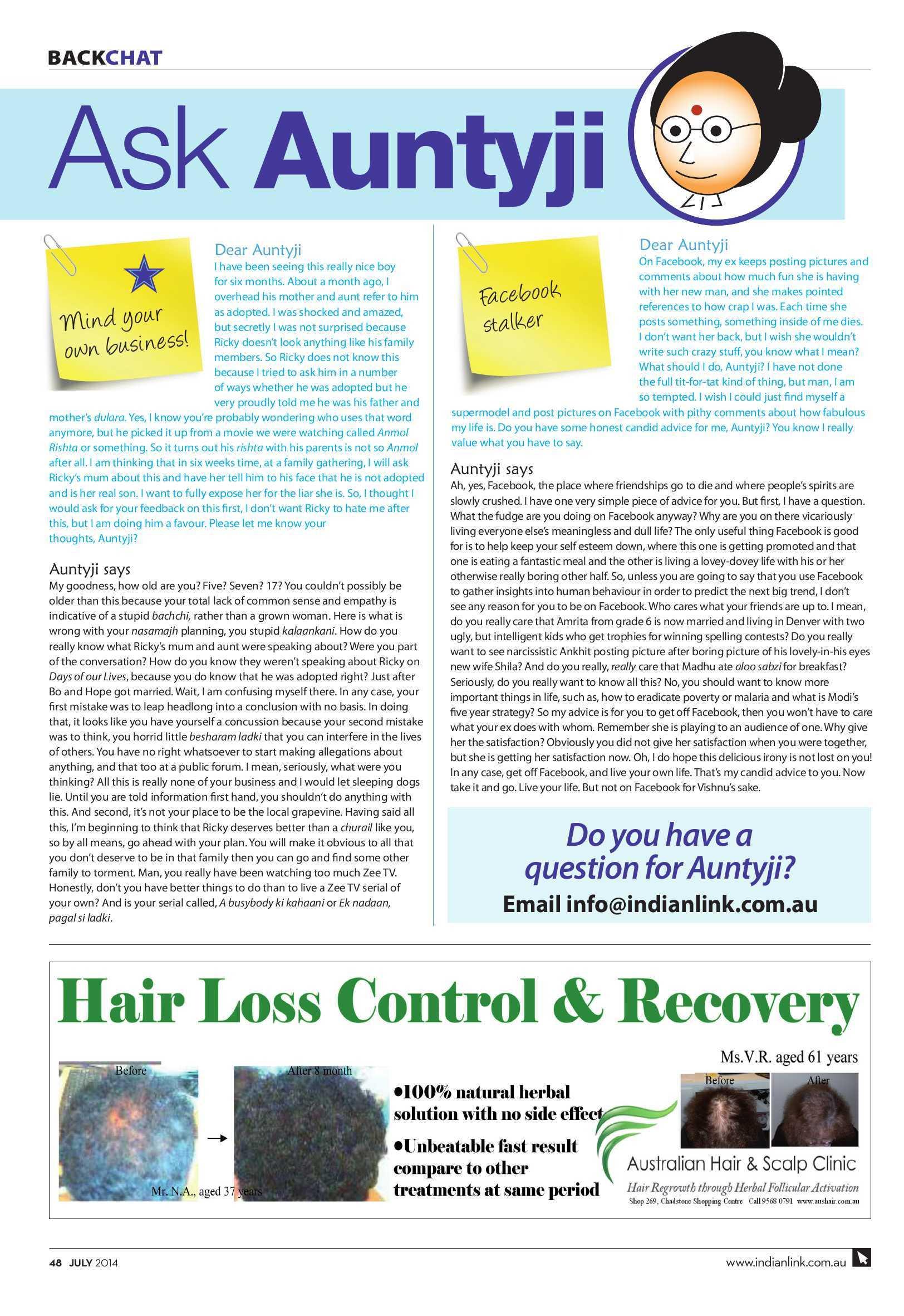 l have been seeing this really nice boy for six m onths. About a month ago, I overhead his mother and aunt refer to him as adopted. I was shocked and amazed, but secret ly I was not su rprised because Ricky doesn't l ook anyt hing like h!s family members. So Ricky does n ot know this because I tried t o ask him in a number of ways w h ether he was adopted b ut he very proudly told me he was his fat her an d mother's du/ara Yes, I know you're probably wondering who uses that word anymore, but he picked It up from a movie we were wat ching called Anmol Rishta or something. So it turns out his rishta with his paren t s is not so Anmol after all. I am th i nking that in six weeks time, at a family gathering, I will ask Ricky's mum about t his an d have her te ll him to h is face t h at he is not adopted a n d is her real son. I wa nt t o fully expose her for the liar she is. So, I thought I would ask for your feedback on this first, I don't want Ricky to hate me after thfs, but I am doing him a favo u r. Please let m e know your thou ghts Aun tyji?