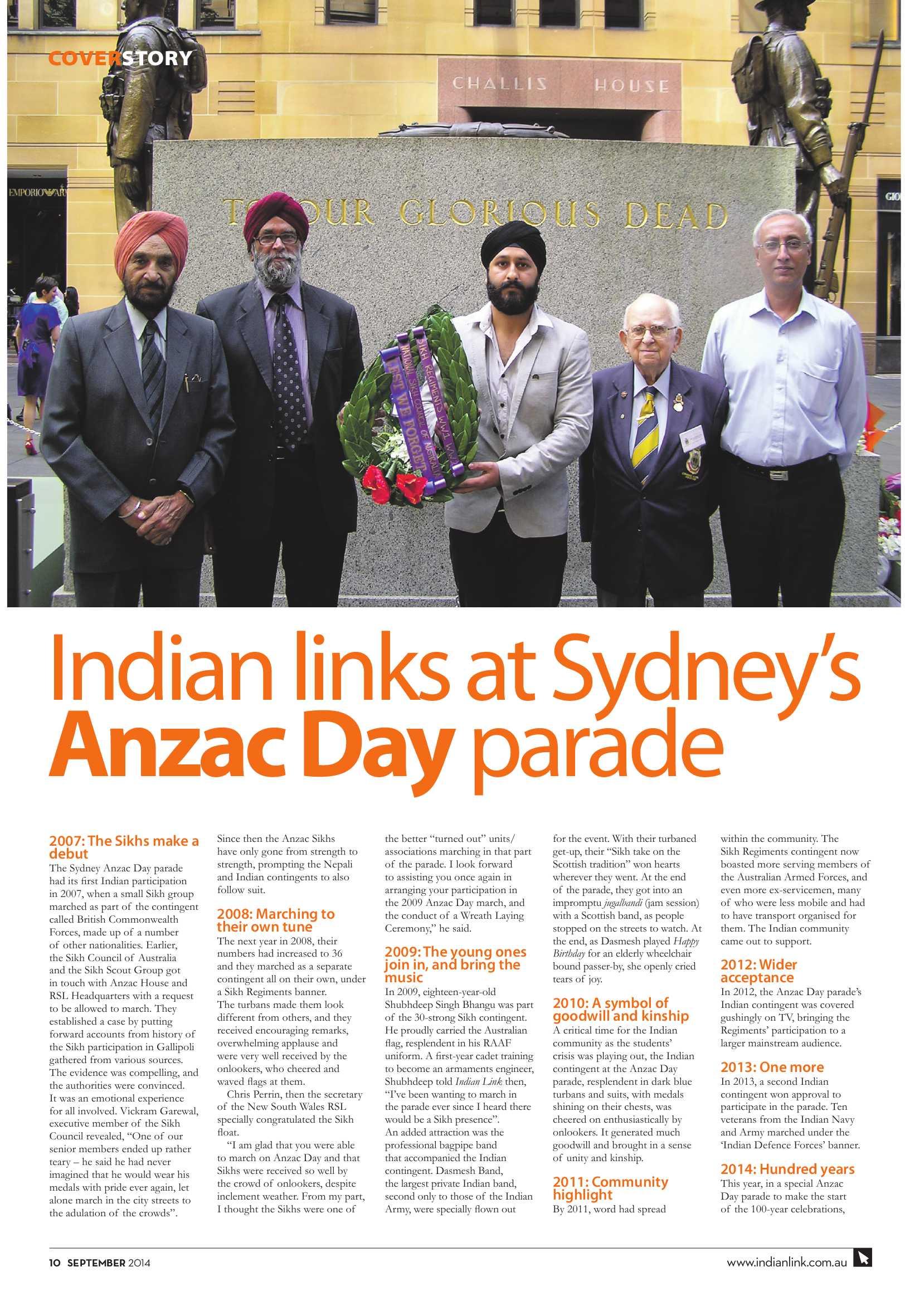 Indian veterans in NS\'{~ Victoria and \YlA have for a few years now marched in d1e annual Anzac Day parades as allied renirned servicemen. In Sydney, Inc:Lian participation was welcomed by the RSL ill 2007, and fo r the past two years, there have been not one, but two contingents marching (Sikh Regiments and lnc:Lian Defence Force s). At die Perth parade, three Indian conttngents cook part d1is year (l,'1/A Sikh Band, Sikh Ex -Serv icemen and Indian Ex -Servi cemen's Association)