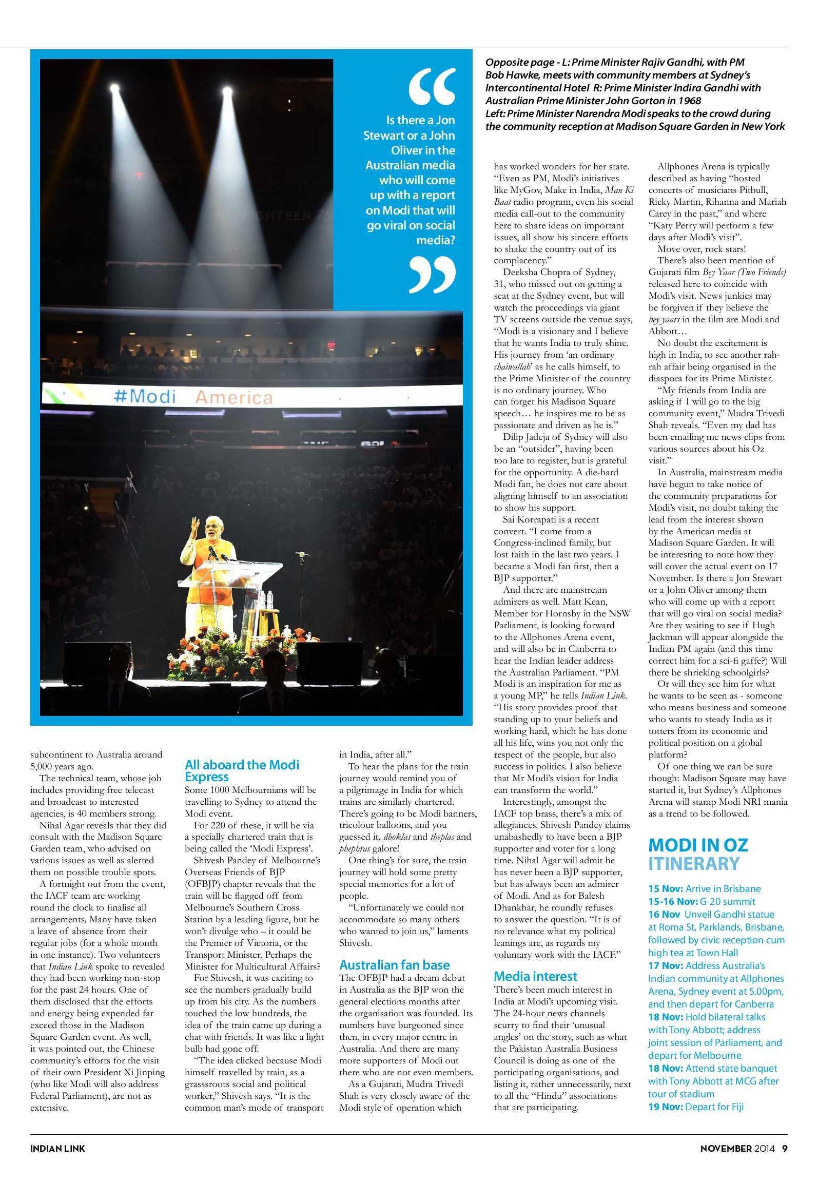"W hen we heard about Modi's Australia visit, we asked the Indian H ig h Com1nission here i f we could organise a com m unity event in Sydney," he reveals. "The political and economic agendas are to be concluded ar the Brisban e, Can berra and Melbourne even ts, a nd so we thoughrwe could have a social engagem ent in Sydney."