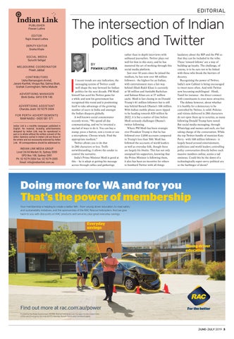 SYDNEY • MELBOURNE • ADELAIDE • BRISBANE • PERTH Level 24/44 Market St, Sydney 2000 • GPO Box 108, Sydney 2001 • Ph: 18000 15 8 47 SYDNEY LINKING INDIA WITH AUSTRALIA FREE JUNE-JULY 2019 n indianlink.com.au PERTH