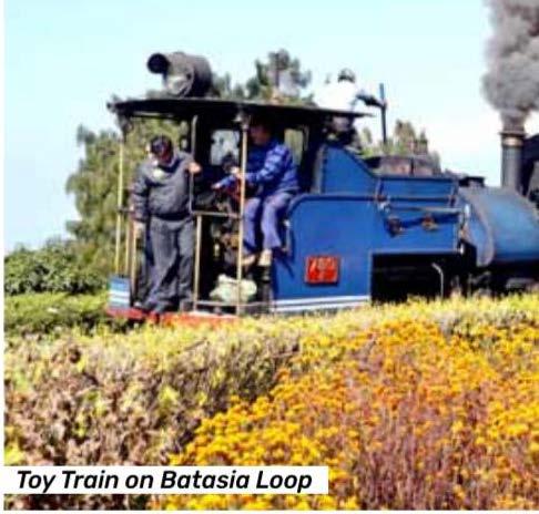 Kanchenjungaandotherunna1ned Hin1aJayanpeaks.Thoughalotofpeople throngthespace,theeclecticserenityofthe atmospherekeepsallqu.ietandarrestedby thebeautyofthescene,untilthearrivalof the 'ToyTrain' - anothericonicattraction ofDarjeeling. Hauled byacentury-old steamengine,the legendarytrainchugs intothelooptoimbueasenseofabygone eraabruptlywalkingintothelivesof onlookers.A sampleofagreatengineering feat,thisfairytalerailwaystartedoperating in 1881,linkingthetorridBengalplains withthemountains.NowaUNESCOWorld Heritage-listed icon,itcoversamuchshorter distanceasawondrousmemoirofthepast.