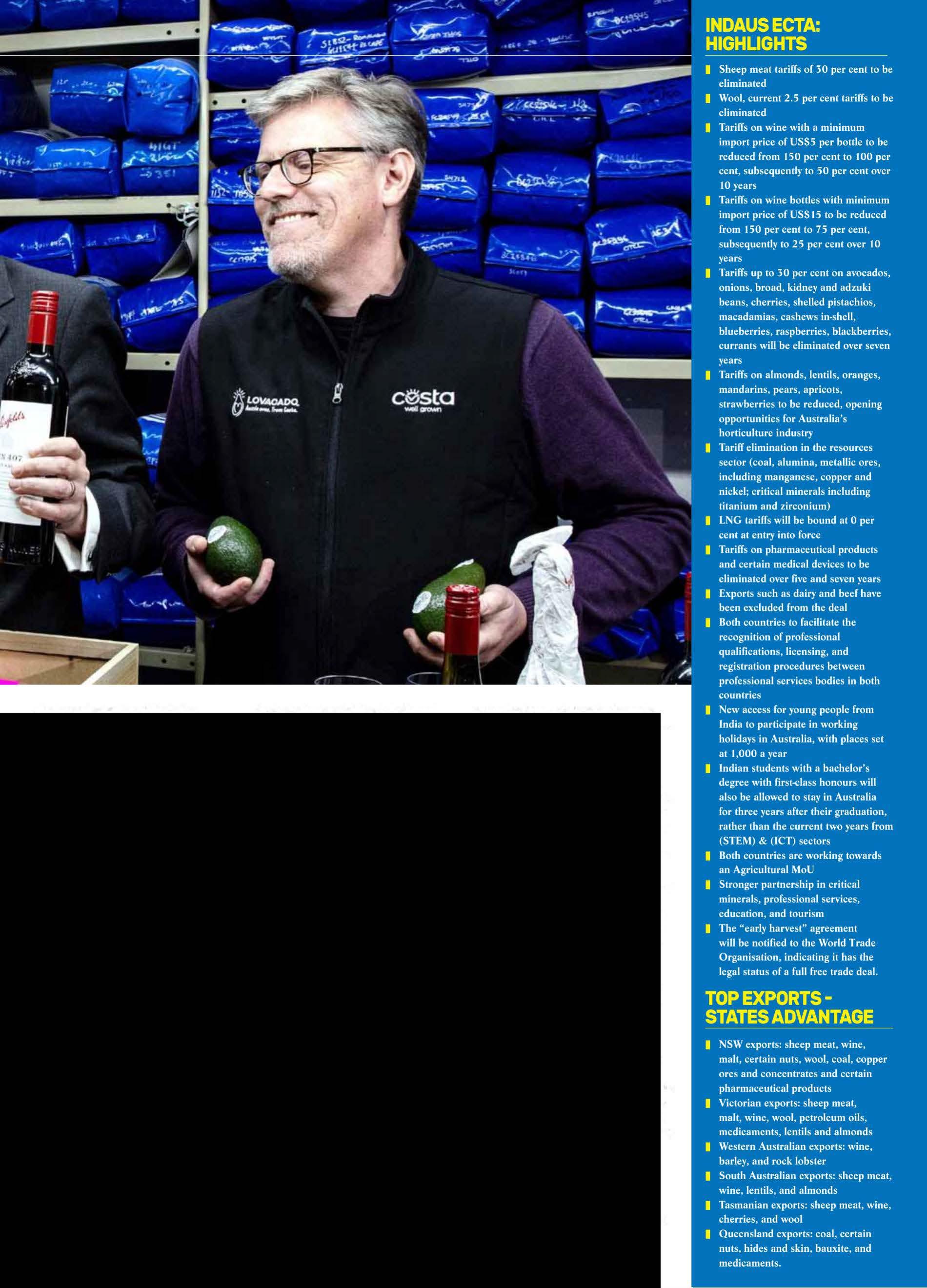 India'sMinisterofCommerceandIndustryPiyushGoyal affirmed hisgovernn1ent'scommitment to buildAustralia'seconomicresilience and securitybyfocusingontheneed for economicdiversification. IndAus ECTAwill allowtariffsto be elin1inated onmorethan 85 percentofAustraliangoodsexports to India (valuedatmore than$12.6 billion ayear),and 96 percentofIndiangoods imports enteringAustralia.Australia's