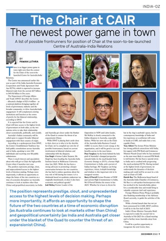 The position represents prestige, clout, and unprecedented access to the highest levels of decision making. Perhaps more importantly, it affords an opportunity to shape the future of the two countries at a time of economic disruption (as Australia continues to look at markets other than China) and geopolitical uncertainty (as India and Australia get closer under the blanket of the Quad to counter the threat of an expansionist China).
