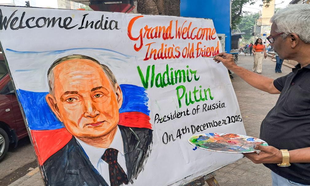 Mumbai: A teacher from Gurukul School of Art making a painting to welcome Russian President Vladimir Putin ahead of his visit to India on December 4, in Mumbai, Friday, November 28, 2025.