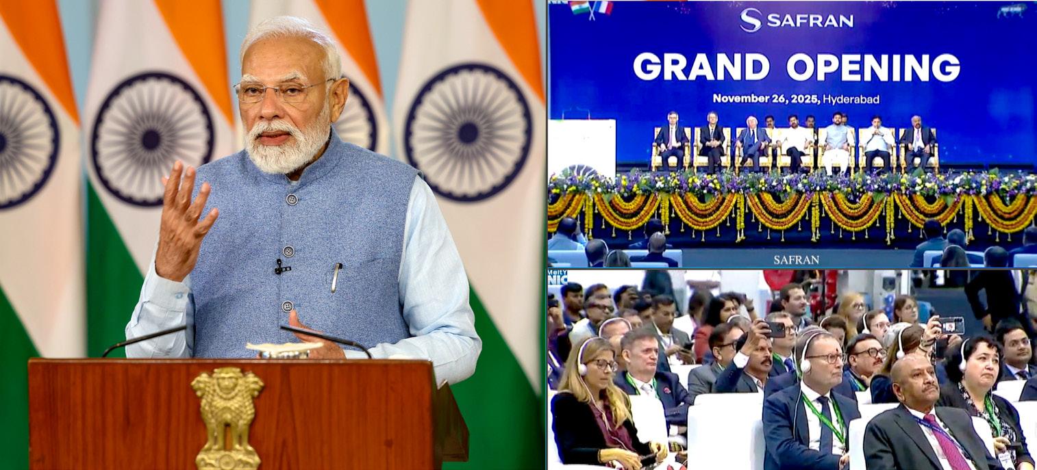 New Delhi: Prime Minister Narendra Modi inaugurates the Safran Aircraft Engine Services India facility via video conferencing (in Hyderabad, Telangana), in New Delhi, Wednesday, November 26, 2025.