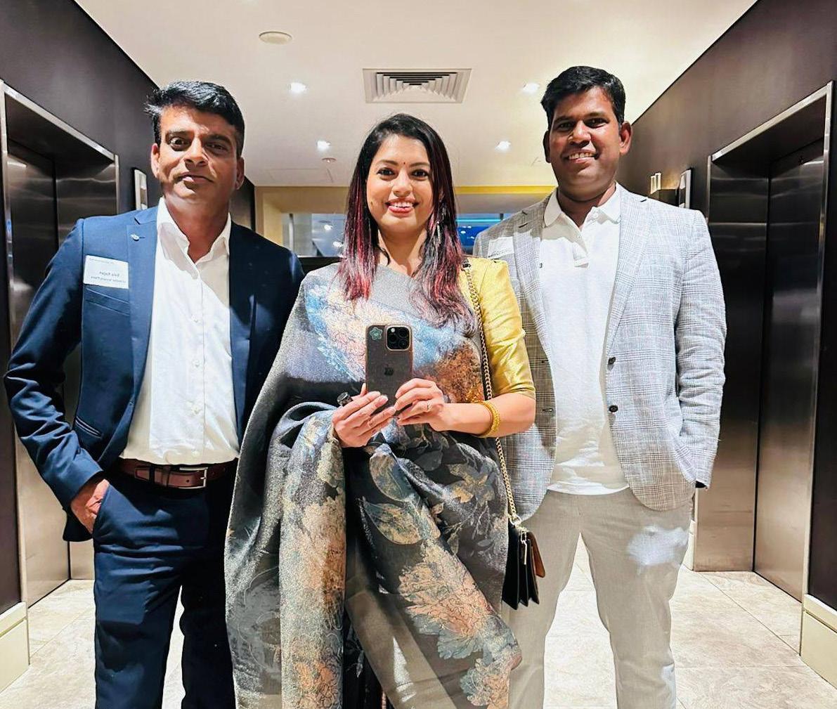 She donned a pink coloured lehenga, as she was clicked alongside the bride’s father, Raj Mantena.