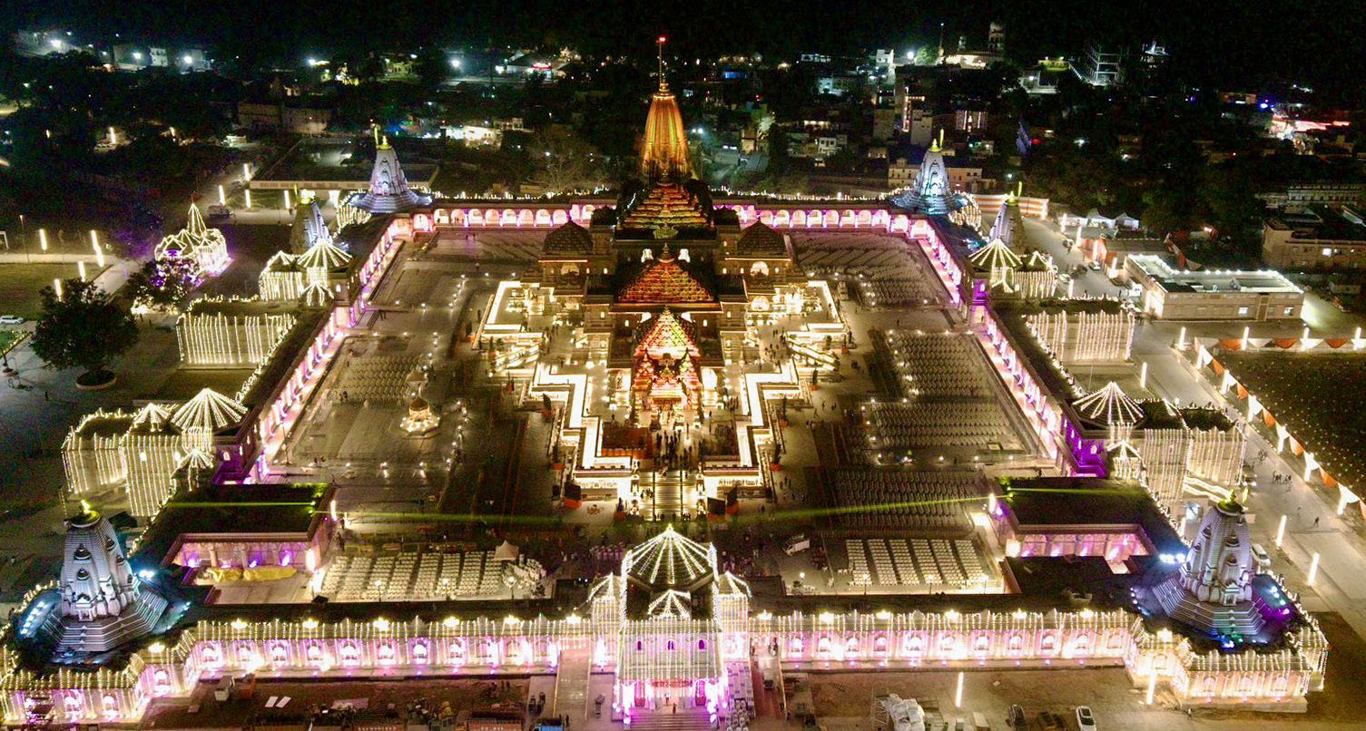 Ayodhya: The Shri Ram Janmabhoomi Temple is decked up with festive lights as the city prepares for the historic Dhwajarohan (flag‑hoisting) ceremony in Ayodhya, Monday, November 24, 2025.