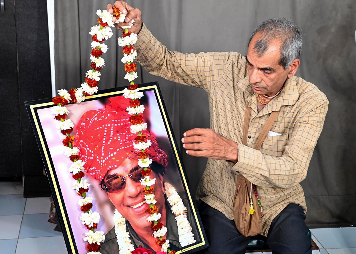 Bikaner: A fan places garlands on a photo banner of veteran actor Dharmendra, paying tribute following his demise at 89, Bikaner, Monday, November 24, 2025.