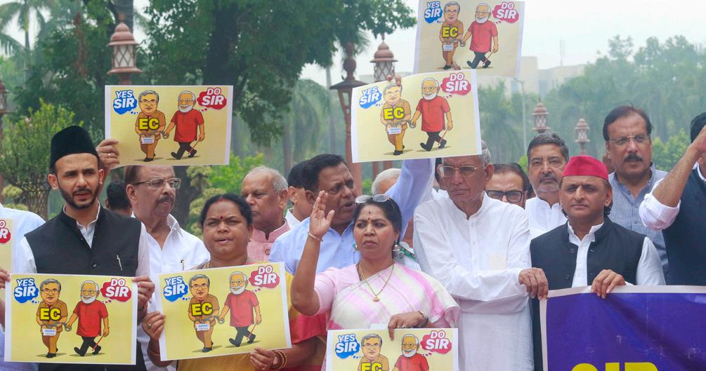 New Delhi: Samajwadi Party (SP) MPs Akhilesh Yadav, Ziaur Rahman Barq, and other opposition MPs hold placards as they protest against the Election Commission’s Special Intensive Revision