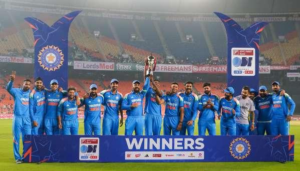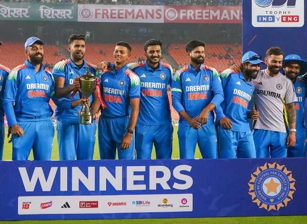 Ahmedabad: Indian players pose with the trophy after winning the ODI cricket series against England at the Narendra Modi Stadium in Ahmedabad on Wednesday, February 12, 2025.