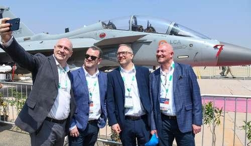 Bengaluru: Foreign delegates taking selfie in front of the LCA Tejas fighter jet during Aero India 2025 at Yelahanka Air Force Station in Bengaluru on Monday, February 10, 2025.