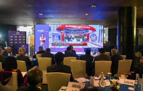 ew Delhi: Industrialists from the business community watch Union Finance Minister Nirmala Sitharaman presenting the Interim Budget 2024 in Parliament, on a projector organised by CII in New Delhi on Saturday, February 01, 2025.