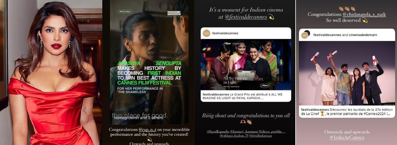 On Monday, Priyanka took to the Stories section of her Instagram and sent her best wishes to the winners, Anasuya Sengupta, Payal Kapadia, and Chidananda S Naik.