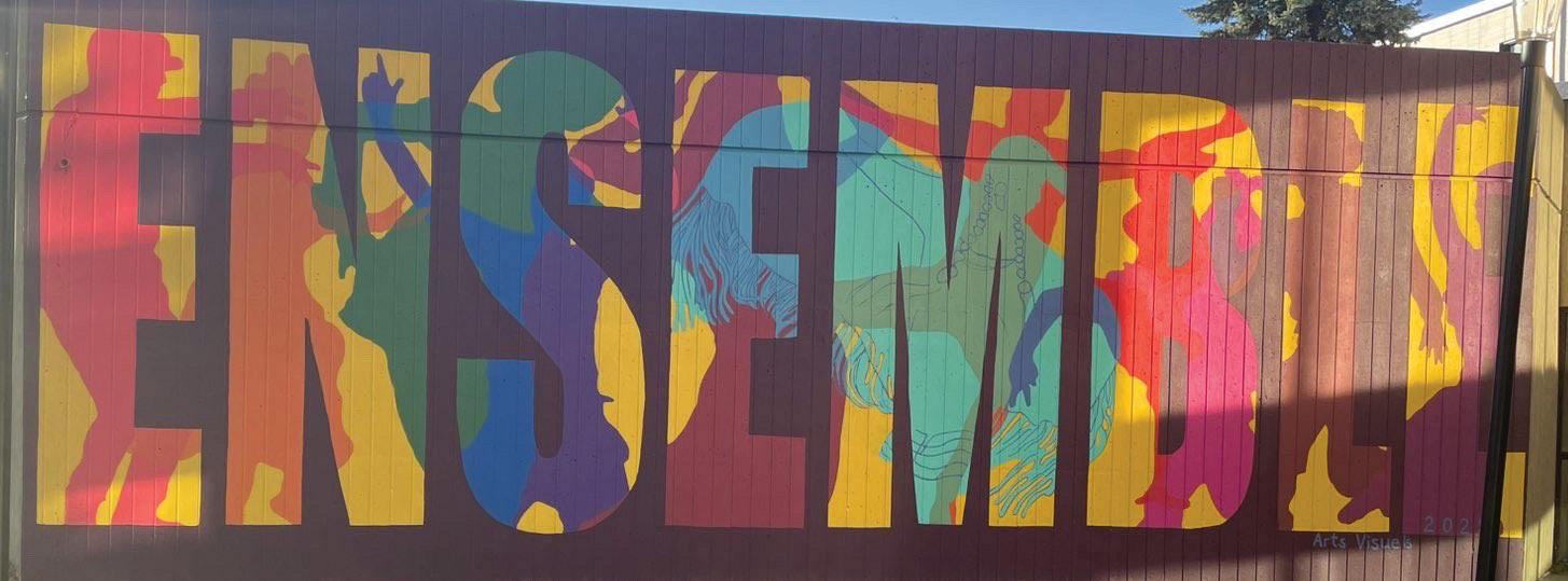 La murale illustre le mot ENSEMBLE qui couvre tout le mur et, dans les lettres, on peut y apercevoir plusieurs danseurs sur un fond jaune. Malaika m’a expliqué que cette murale se distinguait des précédentes par les valeurs qu’elle transmet. Le thème a été proposé par une professeure en éducation spécialisée qui voulait un projet axé sur l’inclusion. L’équipe d’artistes tenait à représenter les valeurs d’intégrité et de rassemblement du cégep. Malaika m’a aussi parlé du processus de