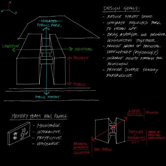 Aplace where Aspies, their close ones and the broader community; can meet, participate in therapies, exchange experiences and learn about Asperger’s Syndrome. One building composed by two main volumes, separated by a semi-public pedestrian alleyway. Not only does the alleyway provide access to an undeveloped and neglected park on the centre of the block, but in doing so, it invites the public to discover the Centre. On every level above the alleyway, different spaces bridge the gap between both main volumes. The Asperger Foundation Centre enables everyone who visits to safely explore closeness, distancing and integration between us all.