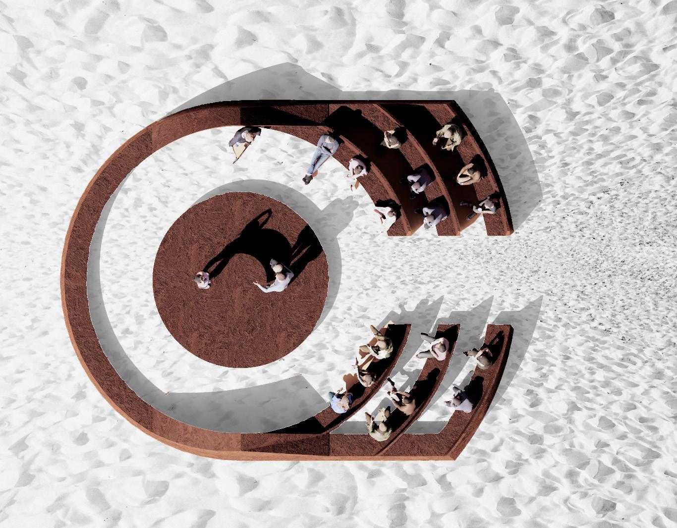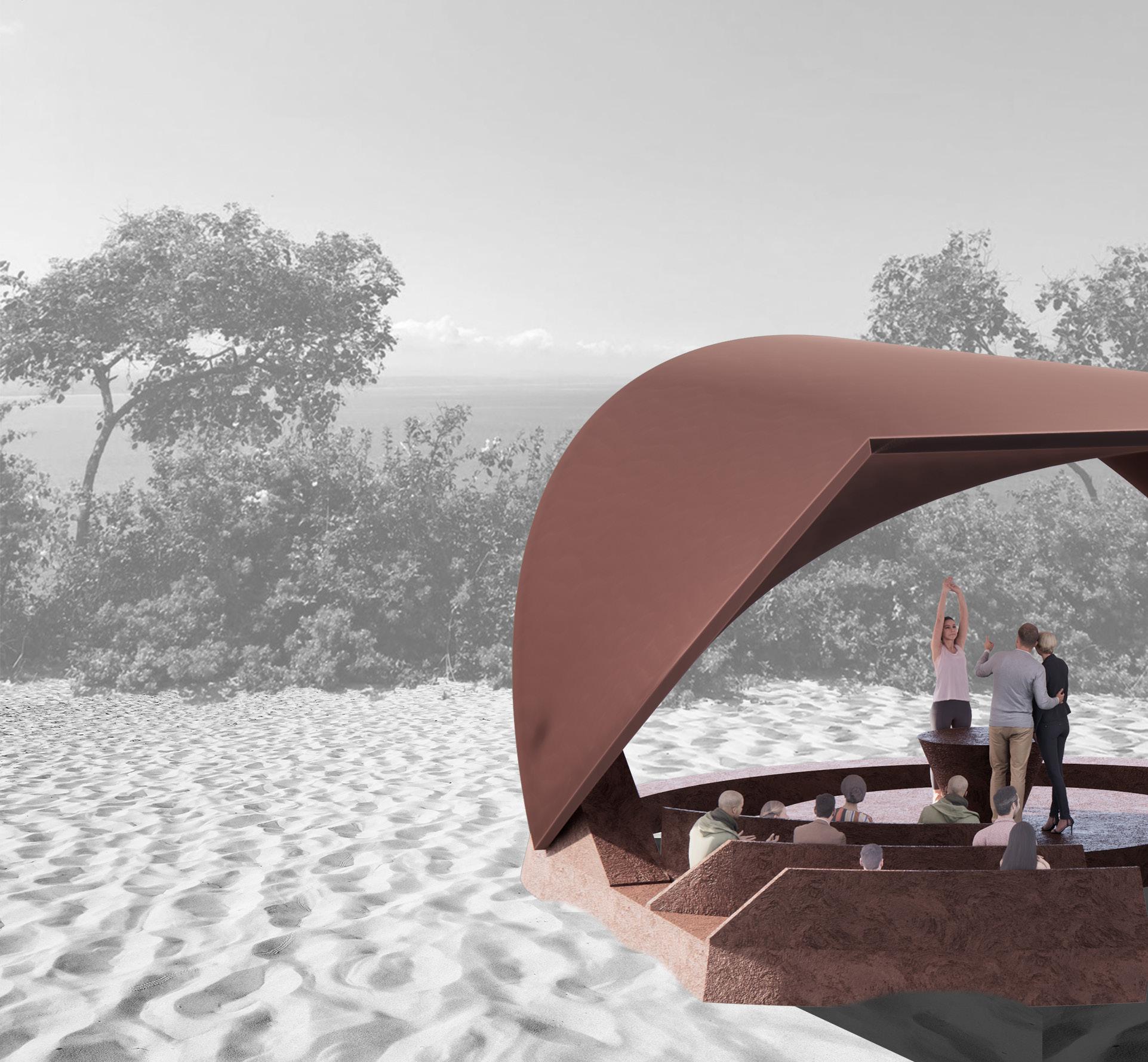 An all-faiths private chapel, intended to open on occasion to the public, for small religious rites. The chapel is composed by two main elements: The ”base” and the “roof”. The first being a continuous ground level concrete structure that hosts users and defines the activities. The second with its curved geometry adapts to the activities underneath. The roof is wide and flat over the entrance, starts curving over the benches and becomes a frame at the sides of the altar, all the while funnelling the view and enhancing the perspective at the everchanging background of the Pacific Ocean.