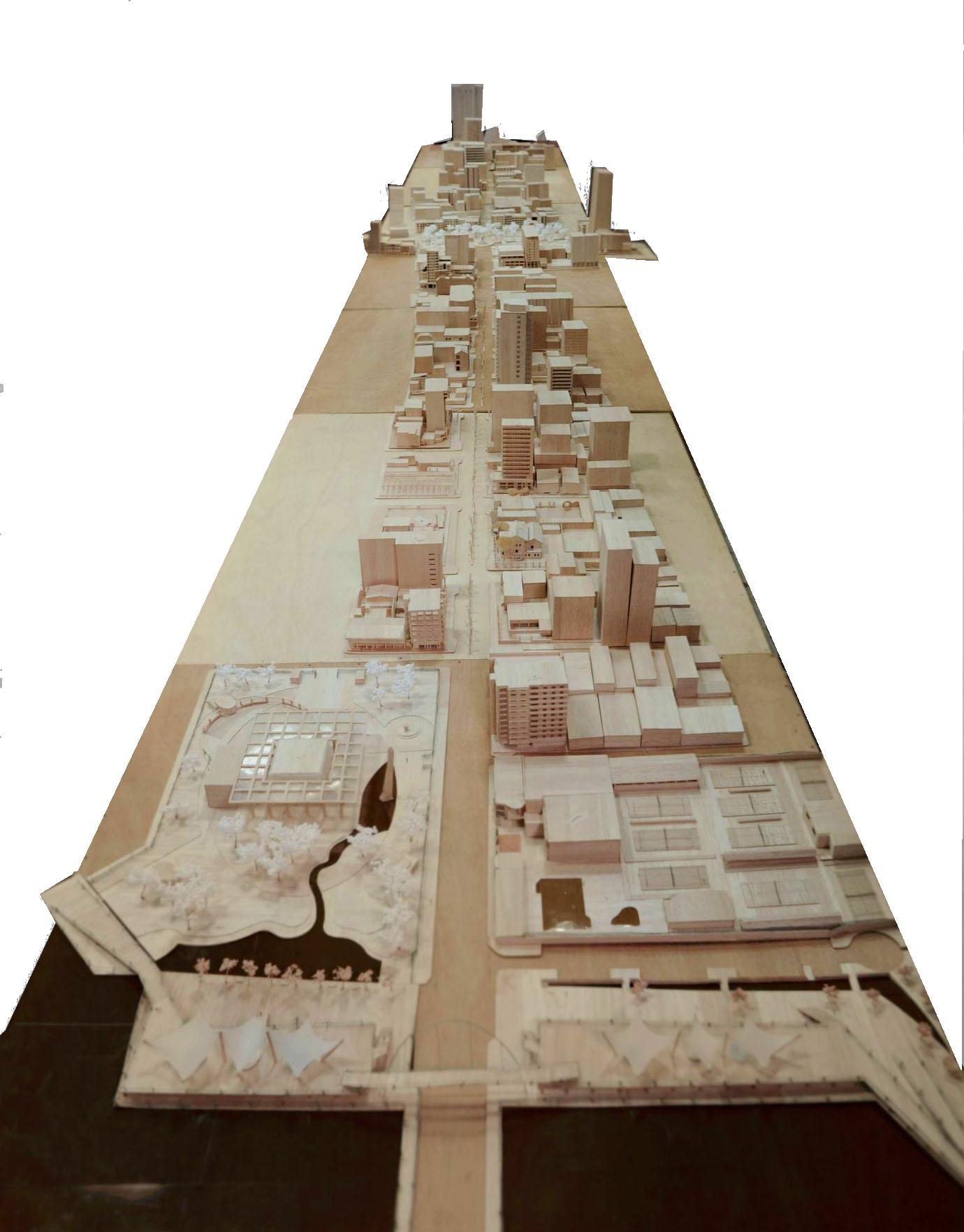 Urban model of 9 Octubre Avenue. The most influential street in Guayaquil, Ecuador. Collaboratively constructed along with architecture school students from different years. Built out of a base plan matched with estimations from observations and measurements during several field trips. (MODELMAKING)