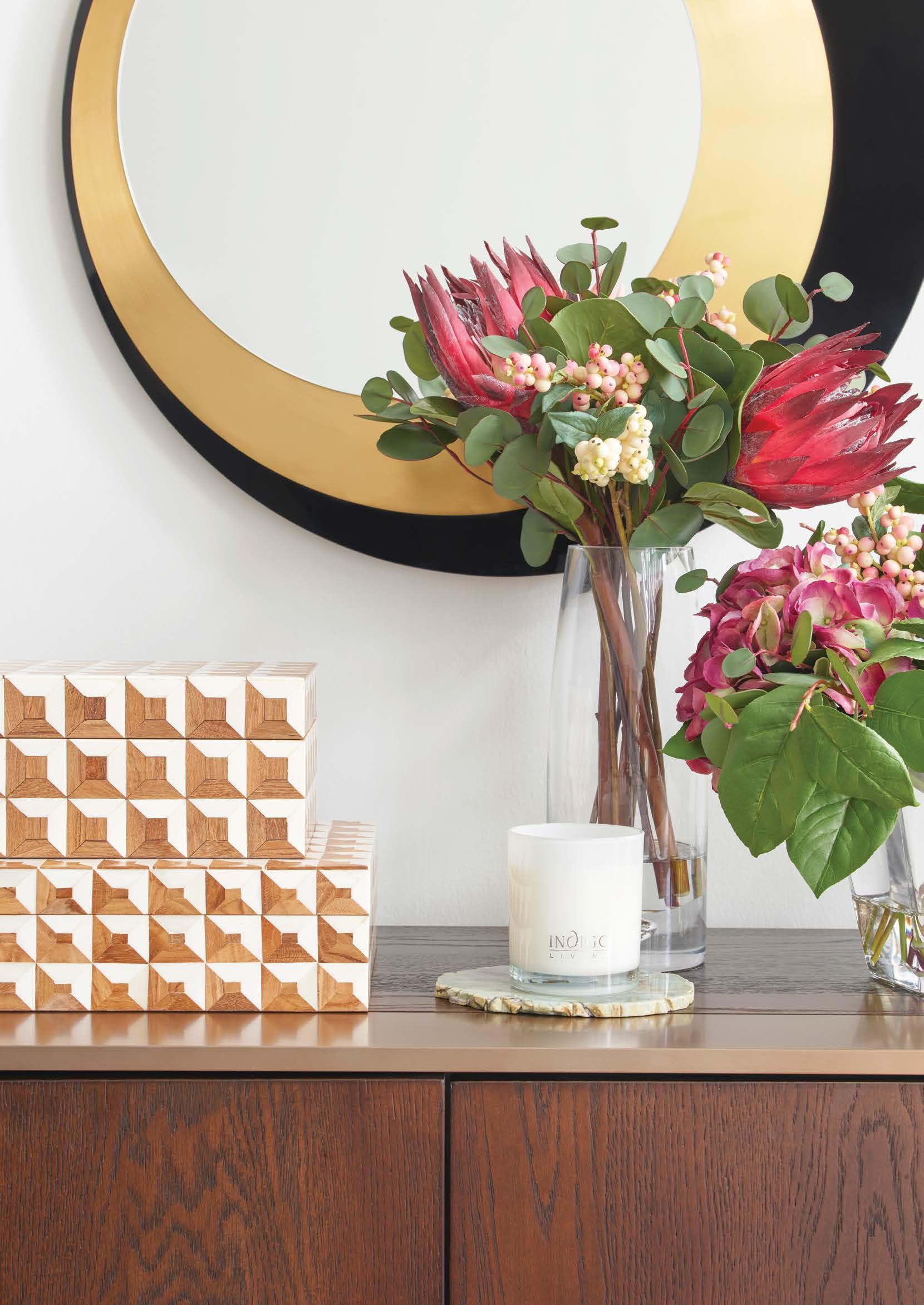 A flawlessly styled console finishes off a foyer, hallway or living space. This season, spruce up your space with contrasting elements – try pairing a contemporary, luxe, marbled console with traditional leather, ceramic and porcelain accessories or placing oversized books as decorative feature pieces.
