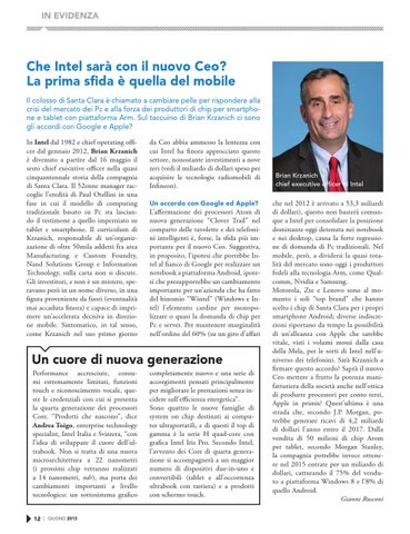 L’affermazione dei processori Atom di nuova generazione “Clover Trail” nel comparto delle tavolette e dei telefonini intelligenti è, forse, la sfida più importante per il nuovo Ceo. Suggestiva, in proposito, l’ipotesi che porrebbe Intel al fianco di Google per realizzare un notebook a piattaforma Android, ipotesi che presupporrebbe un cambiamento importante per un’azienda che ha fatto del binomio “Wintel” (Windows e Intel) l’elemento cardine per monopolizzare o quasi la domanda di chip per Pc e server. Per mantenere marginalità nell’ordine del 60% (su un giro d’affari