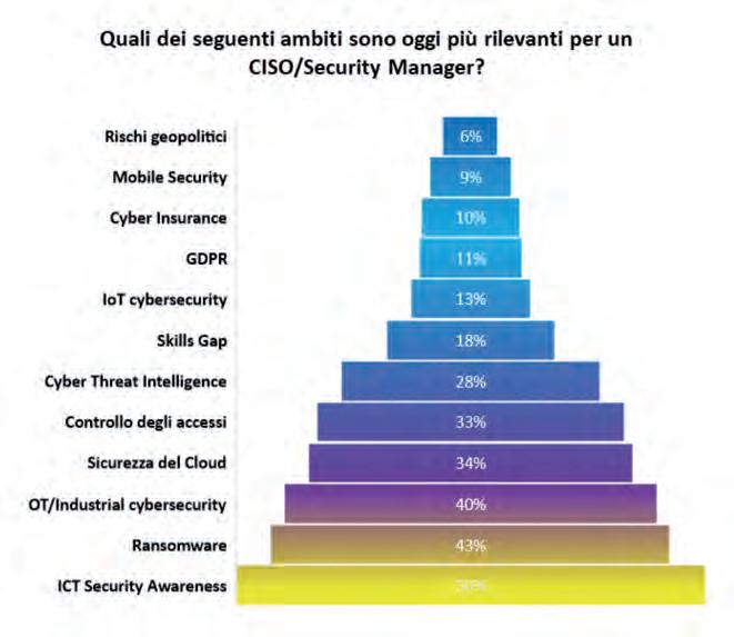 Nell’ultimo anno il costante battagemediatico sulle azioni di cyberwar sembra aver sortito l’effetto di rendere le aziende più consapevoli dei rischi del cybercrimine. Una ricerca condotta a dicembre 2022 da The Innovation Group e Csa-Cyber Security Angels su un campione di duecento aziende italiane mostra che i rischi geopolitici sono una priorità solo per il 9% dei chief information security officer (Ciso) o ruoli analoghi. In compenso, la sicurezza dei sistemi industriali OT (Operational Technology) è stata citata come priorità dal 40% degli intervistati, e si potrebbe cogliere un legame con gli attacchi alle infrastrutture critiche avvenuti negli ultimi anni nel contesto di tensioni geopolitiche (ne parliamo a pag. 7). Protagonisti delle cronache sono anche, negli ultimi anni e nel conflitto russo-ucraino, i ransomware: non a caso, per il 43% dei Ciso intervistati sono una delle principali questioni da affrontare quest’anno. Il problema numero uno si conferma qui, come in altre survey sul tema, la scarsa competenza e consapevolezza del personale aziendale in fatto di cybersicurezza. E questo vale per tutte le categorie di imprese considerate, piccole, medie e grandi.