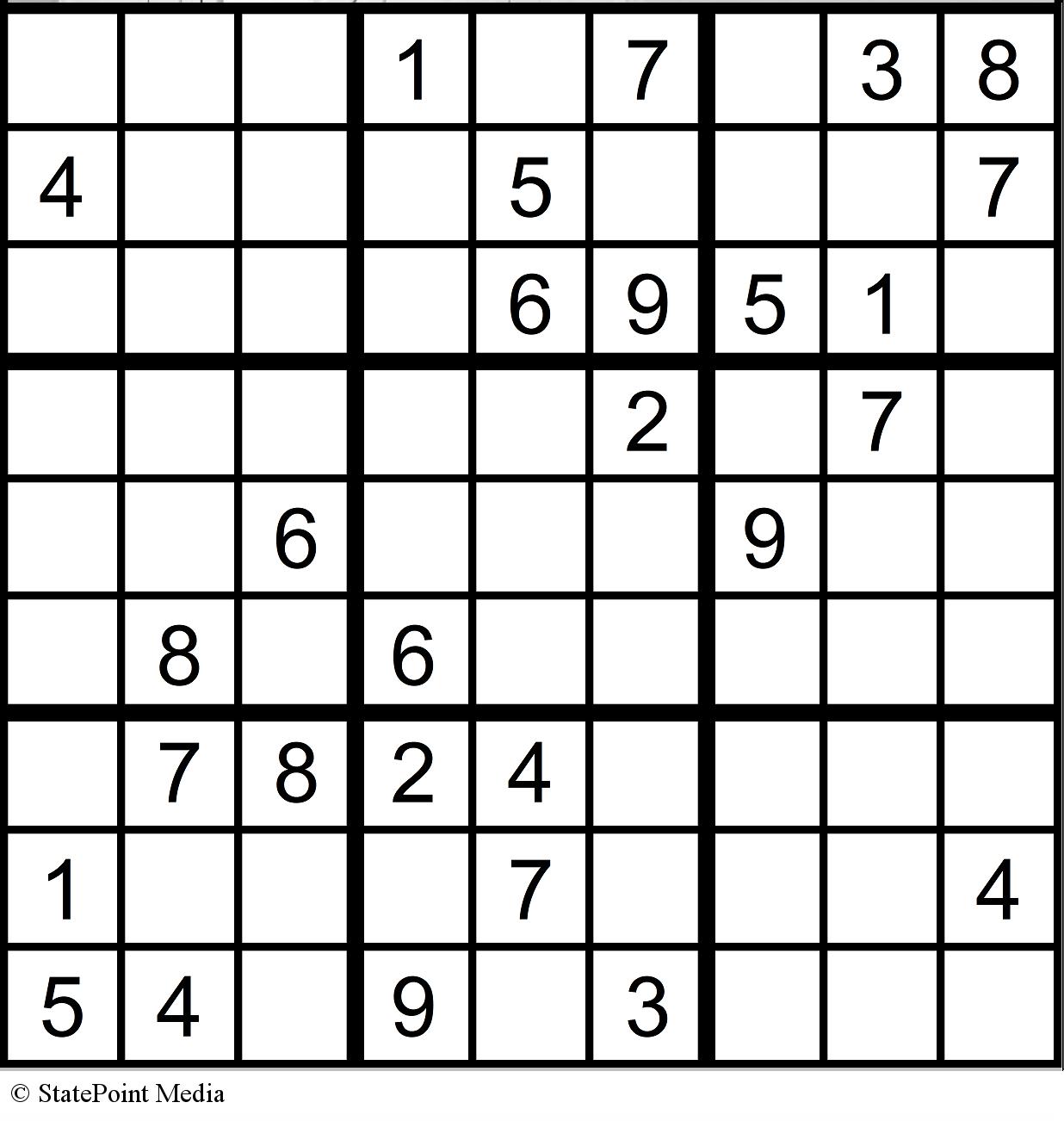 Place a number in the empty boxes in such a way that each row across, each column down and each 9-box square contains all of the numbers from one to nine.