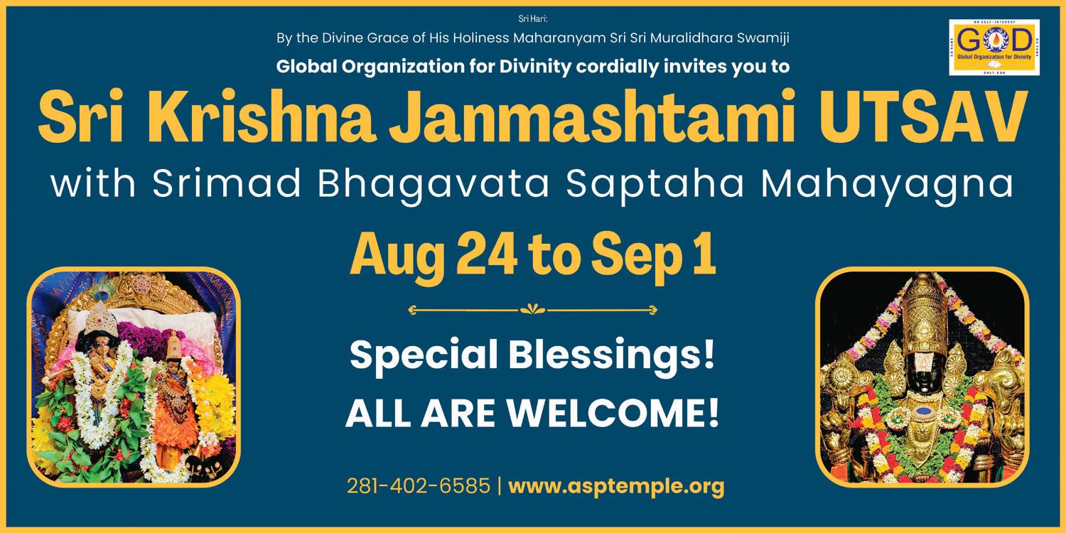 will be held from Sat Aug 24 to Sun Sep 1 at Namadwaar / Sri Aishwarya Srinivasa Perumal Temple in the Pearland area. This utsav is an opportunity for devotees to immerse themselves in Krishna katha and kirtan all week, and also accrue immense merit and be the recipients of Bhagavan’s grace by simply attending such a Bhagavata Mahotsav, as emphasized in our scriptures (Padma Purana).