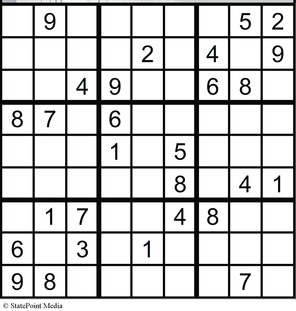 Place a number in the empty boxes in such a way that each row across, each column down and each 9-box square contains all of the numbers from one to nine.