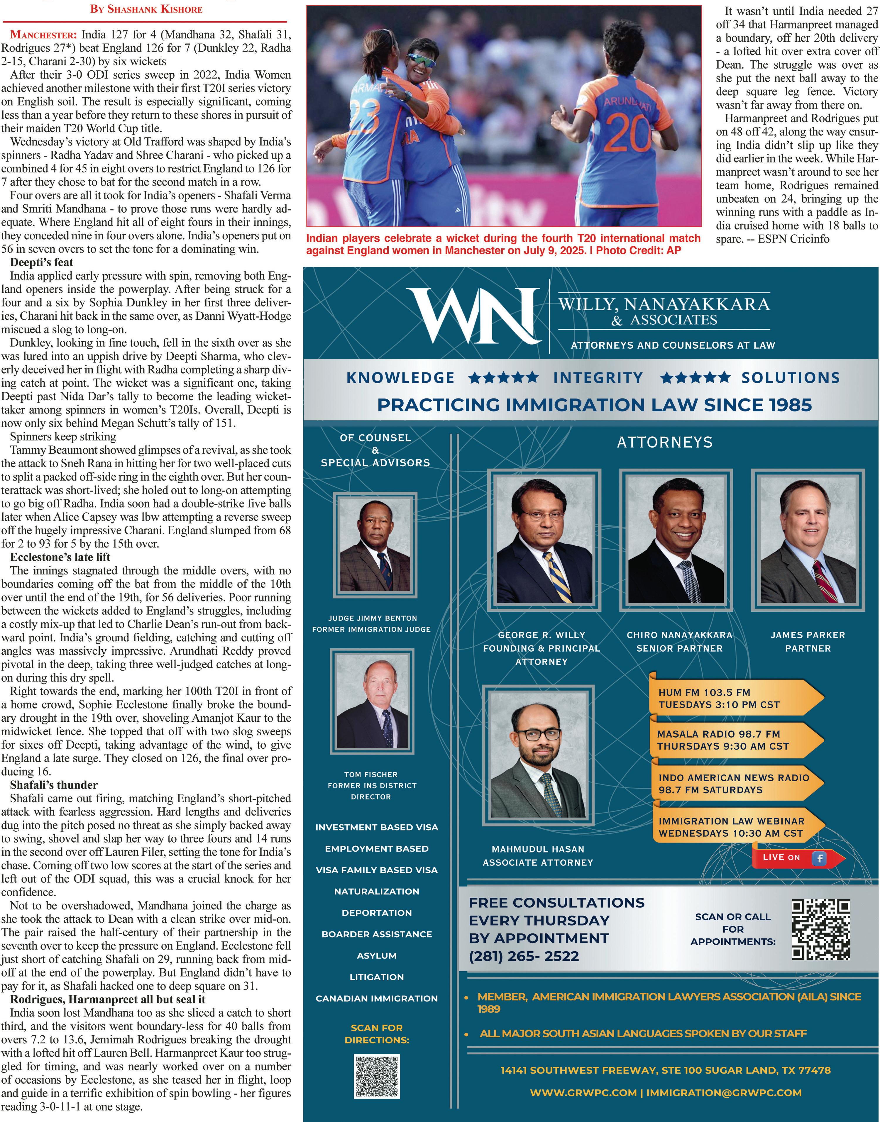®All rights reserved. No material herein or portions thereof may be published without the written consent of the publisher. Deadline for advertising and articles is 4 pm on Monday of each week. Please include self-addressed, stamped envelope for return of all unsolicited material. Published at 7457 Harwin Drive, Suite 212, Houston, Texas 77036.Tel:713-789-6397, email: indoamericannews@yahoo.com, website: www.indoamerican-news.com