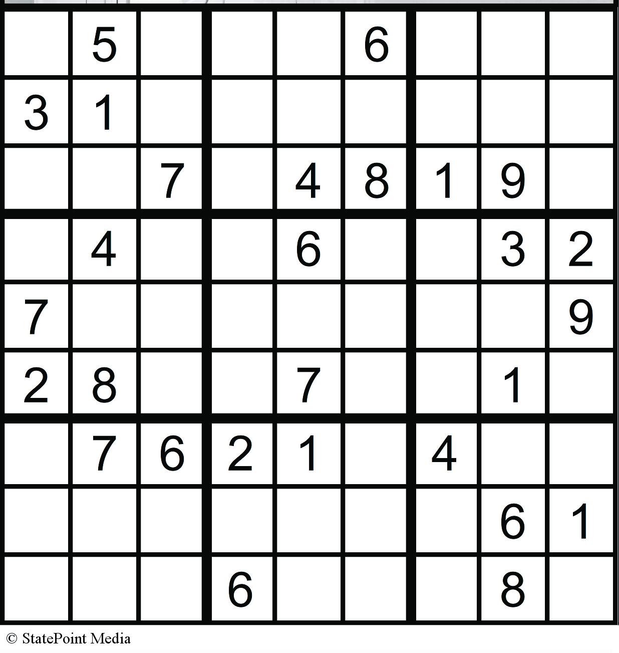 Place a number in the empty boxes in such a way that each row across, each column down and each 9-box square contains all of the numbers from one to nine. Last