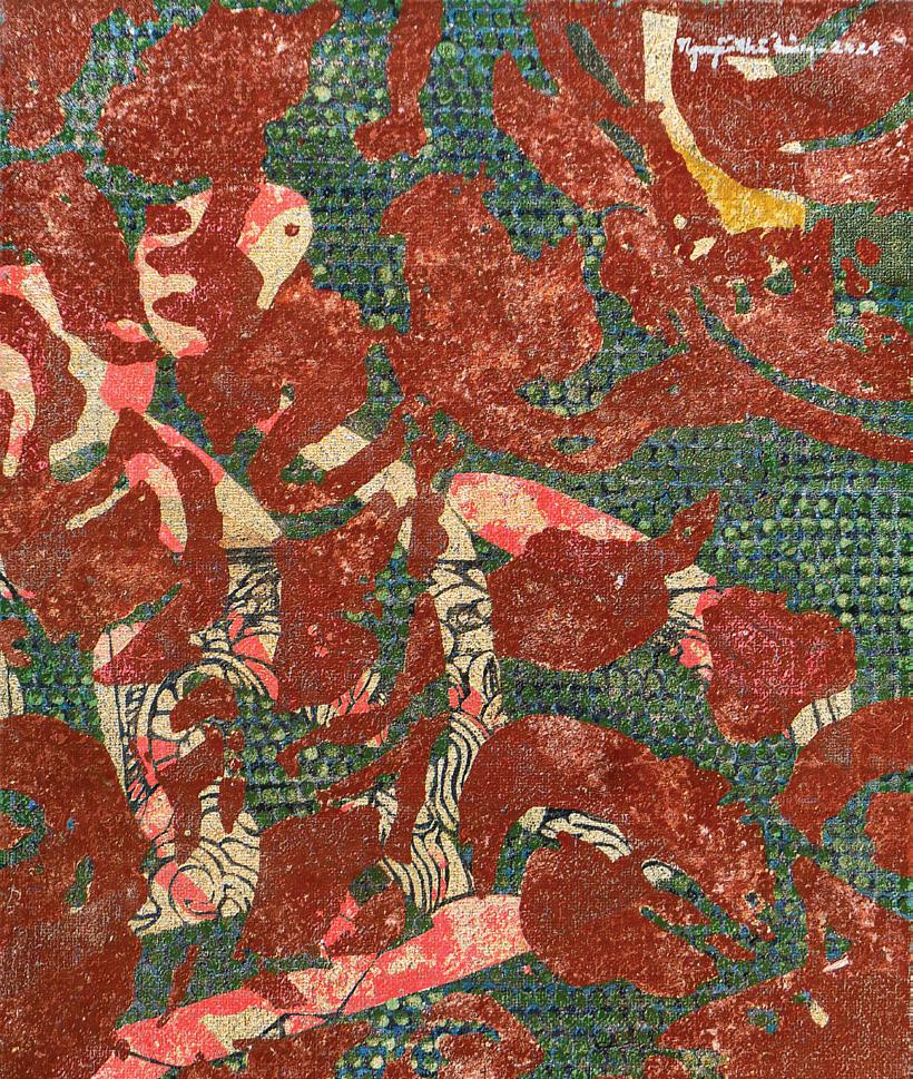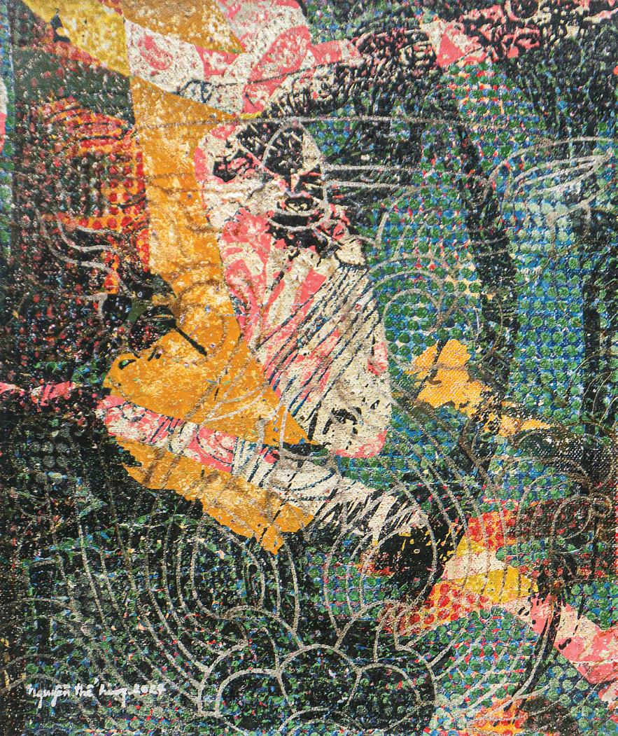 His technique in transferring the desired images in lacquer pigments onto the stretched canvas, and through the processes of polishing and superimposing, has been instrumental in his expert use of traditional Vietnamese folklore and patterns and textures from virtually any ‘matters’ that he would come across in the urban or remote environ of the daily life of the Vietnamese cities, is superb and brilliant.
